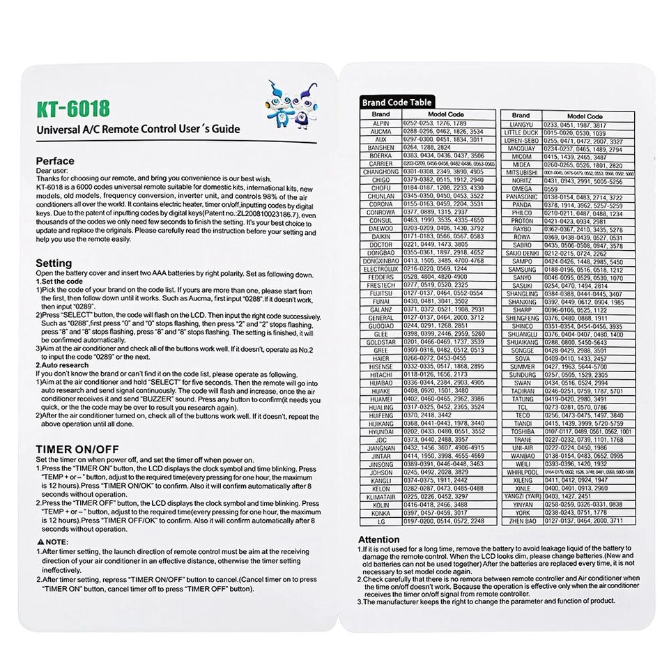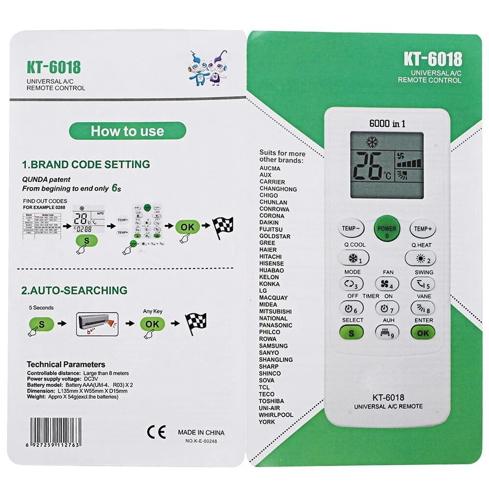 KT-6018รีโมทคอนโทรลเครื่องปรับอากาศสากลสำหรับ aux/carer/changhong /chigo/fordaikin/gree /hier/hisense