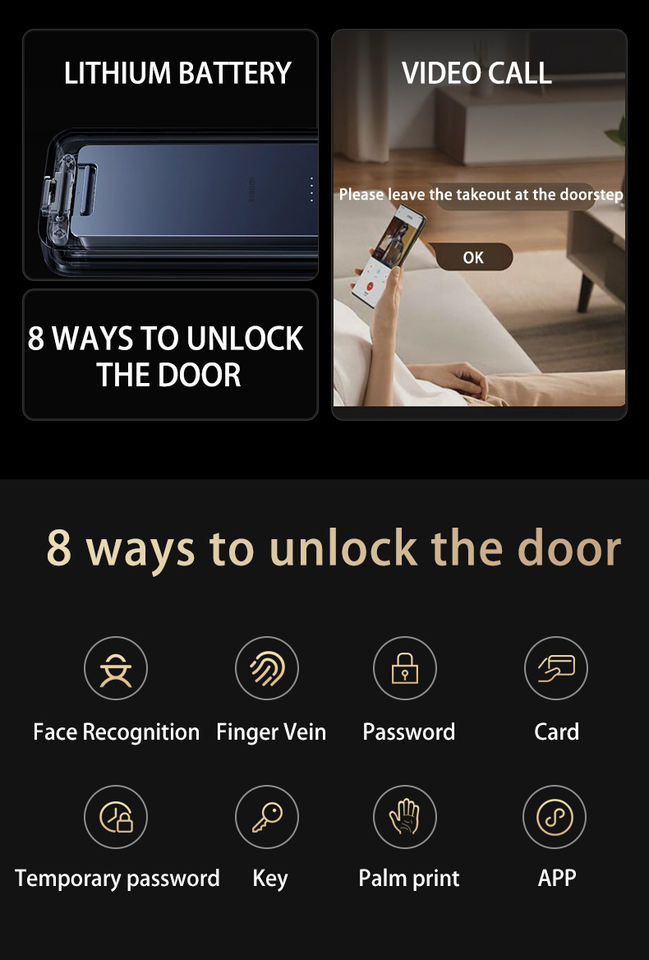 วิธีปลดล็อค:โทรศัพท์ + ใบหน้า + หลอดเลือดดำปาล์ม + หลอดเลือดดำนิ้ว + รหัสผ่าน + บัตร + คีย์