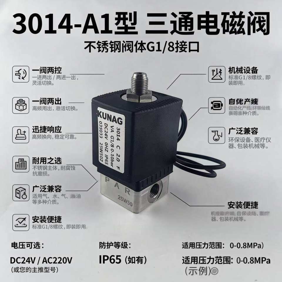 วาล์วโซลินอยด์สามทาง KUNAG 3014-C20F G1/8 DC24V วาล์วควบคุมสื่อแบบอุณหภูมิปกติ