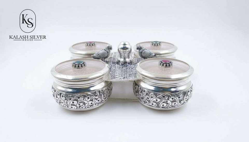 กล่องใส่ผงทองคำขาว 925 ยี่ห้อ Kalash Silver House บรรจุ 4 ช่อง พร้อมฝาประดับอัญมณี และรูปปั้นนกเงินตกแต่ง สำหรับพิธีบูชา