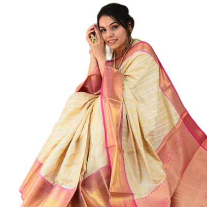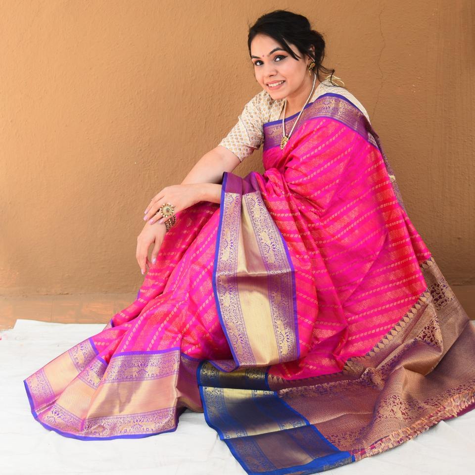 Kanchipuram ผ้าขี้ริ้วผ้าไหมทอ,สานด้วยมือสไตล์ซารีคอนทราสต์สุดหรูเส้นขอบทอแบบ Pallu N Zari