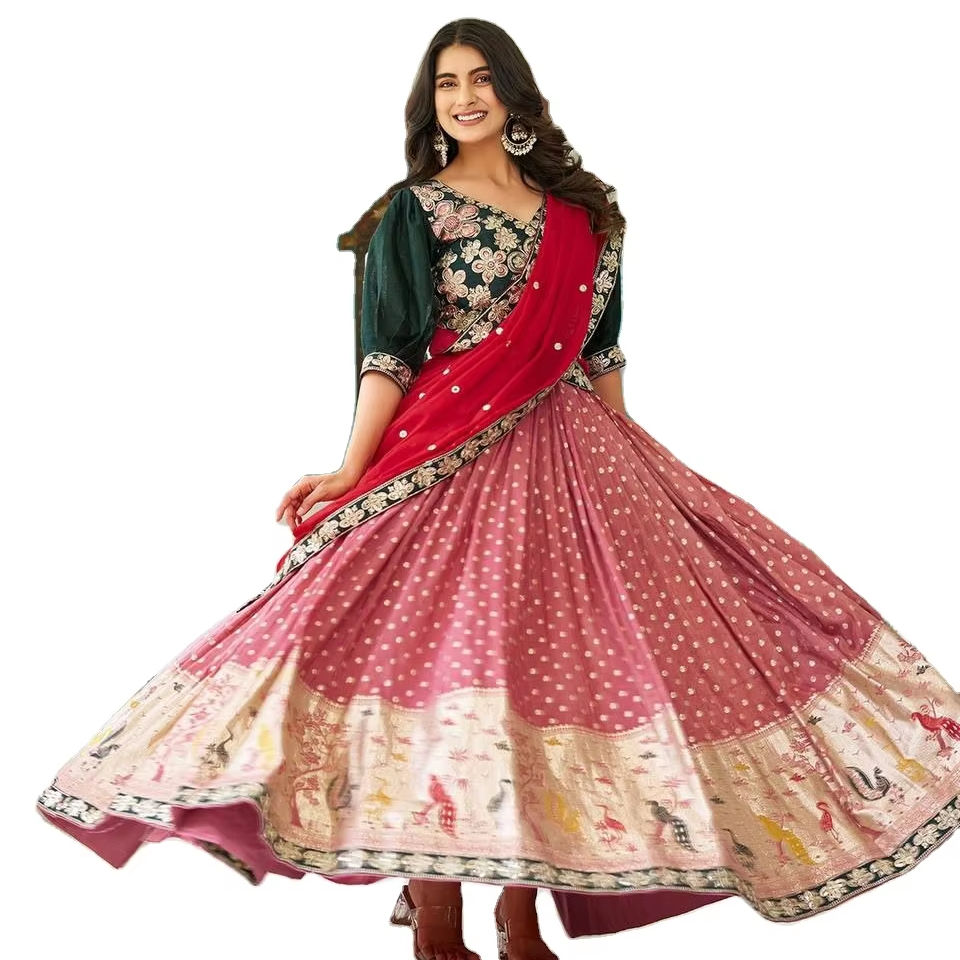 ชุดคอลเลกชั่นแต่งงานสไตล์ kanjeevaram lehenga choli georgette ผ้าไหมสีสดใสลายแฟนซีแขนใส่สบาย