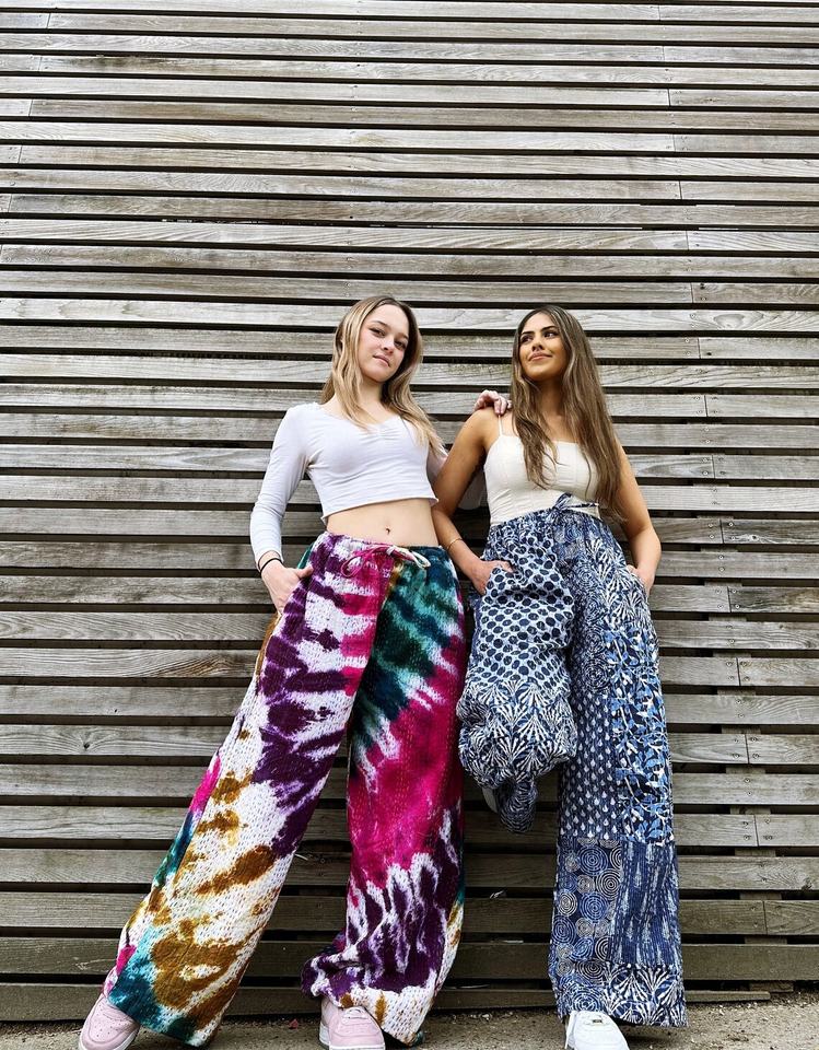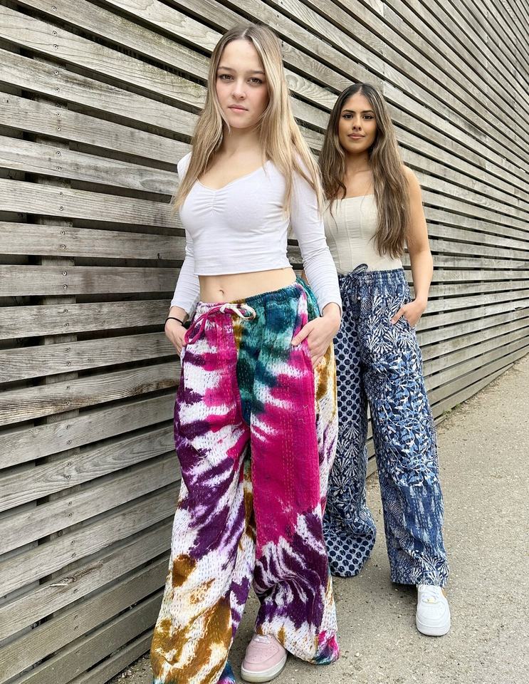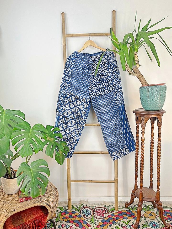 Kantha กางเกงฮาเร็มผ้าฝ้ายปะต่อปลายบานมีสไตล์โบฮีเมียนเก๋ไก๋ทันสมัยเทศกาลเอวสูงเก๋ไก๋ลำลองสำหรับฤดูร้อน