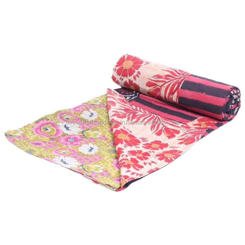 Kantha ผ้านวม gudari GD084 Kantha ผ้าห่ม gudari อินเดียกลับด้านได้เย็บผ้าห่มส่าหรีแบบเก่าทำงานหนัก