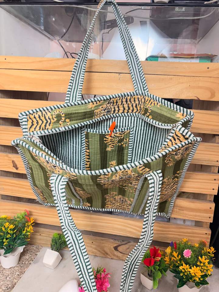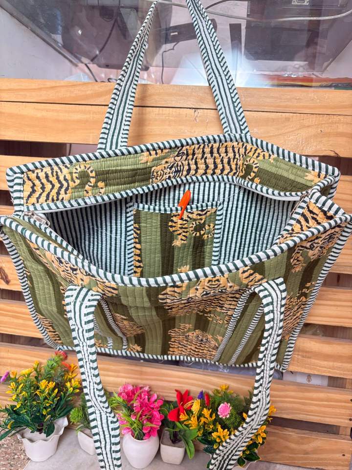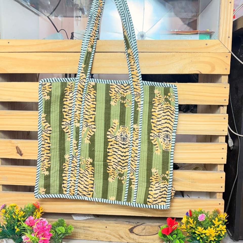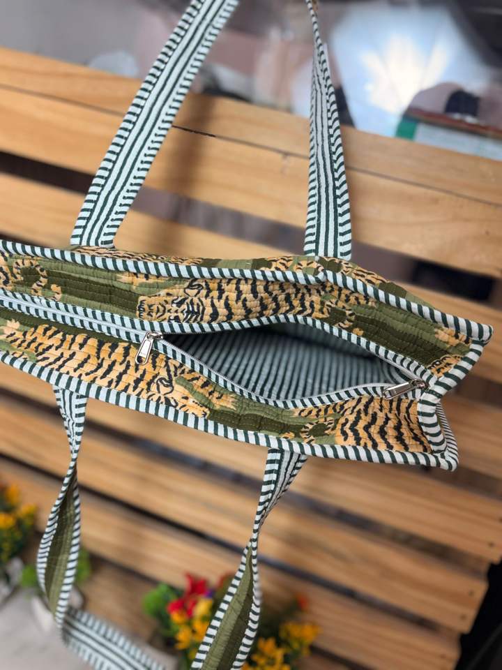 กระเป๋าโท้ทลายเสือคันธา สีเขียว ผ้าฝ้ายลายเสือแบบควิลท์ กระเป๋าโท้ทลายเสือสีเขียว กระเป๋าโท้ทสะพายไหล่ลายเสือ