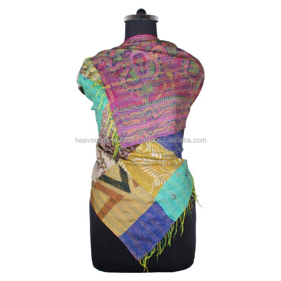 Kantha แผ่นปะผ้าไหมงานแฮนด์เมดผ้าพันคอสไตล์วินเทจผ้าพันคอดีไซน์ทันสมัยสำหรับเด็กผู้หญิงผ้าพันคอ SC1456วินเทจผ้าเย็บมือสไตล์วินเทจ