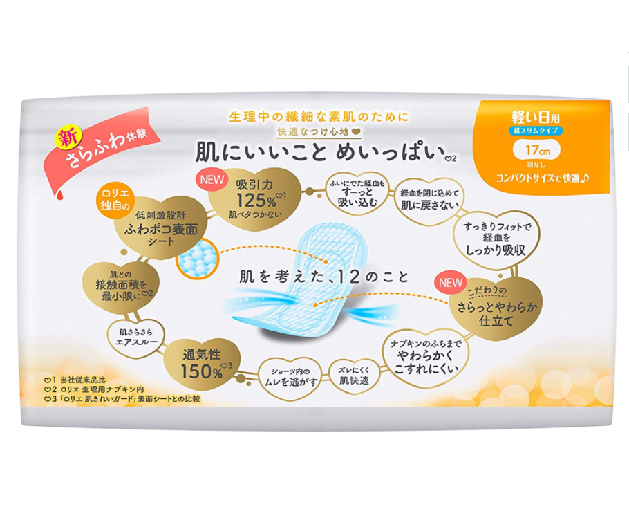 ผ้าอนามัยแบบมีปีก คาโอ ขนาด 17 ซม. แบบญี่ปุ่น 32 ชิ้น ซึมซับดีเยี่ยม ระบายอากาศได้ดี ผลิตจากผ้าฝ้าย ดีไซน์สำหรับผู้แพ้ง่าย ใช้กลางวัน ป้องกันการรั่วซึม