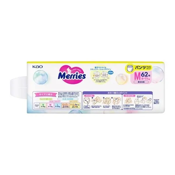 ผ้าอ้อมเด็กแบบกางเกง คาโอ สำหรับญี่ปุ่น ผลิตจากวัสดุเป็นมิตรต่อสิ่งแวดล้อม ซึมซับดีเยี่ยม ระบายอากาศได้ดี สำหรับเด็กแรกเกิด-เด็กเล็ก ไซส์ M 62 ชิ้น ขายส่ง/จำนวนมาก