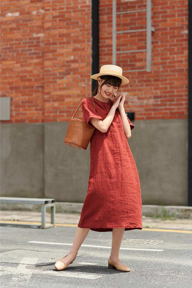 Product Name:Linen Midi Dress Short Sleeve Dress