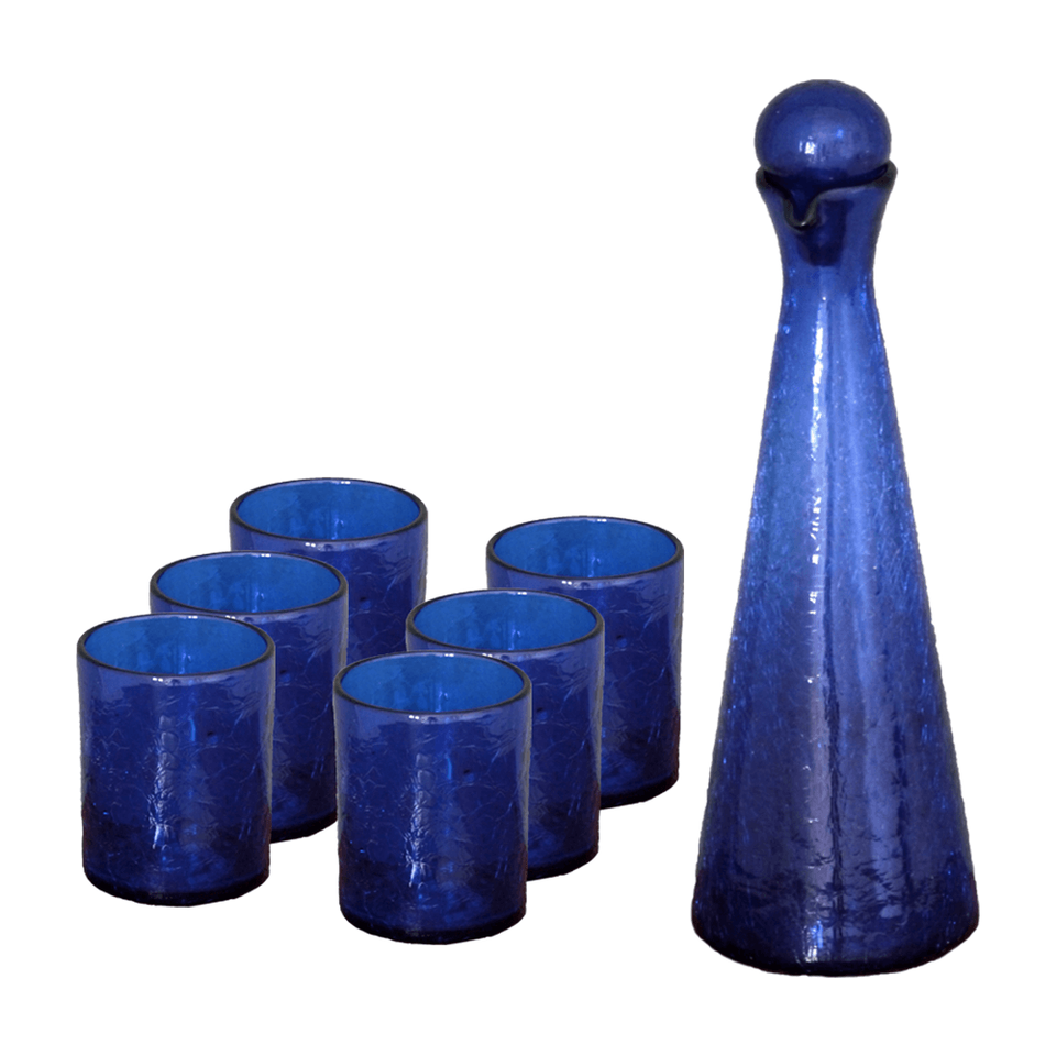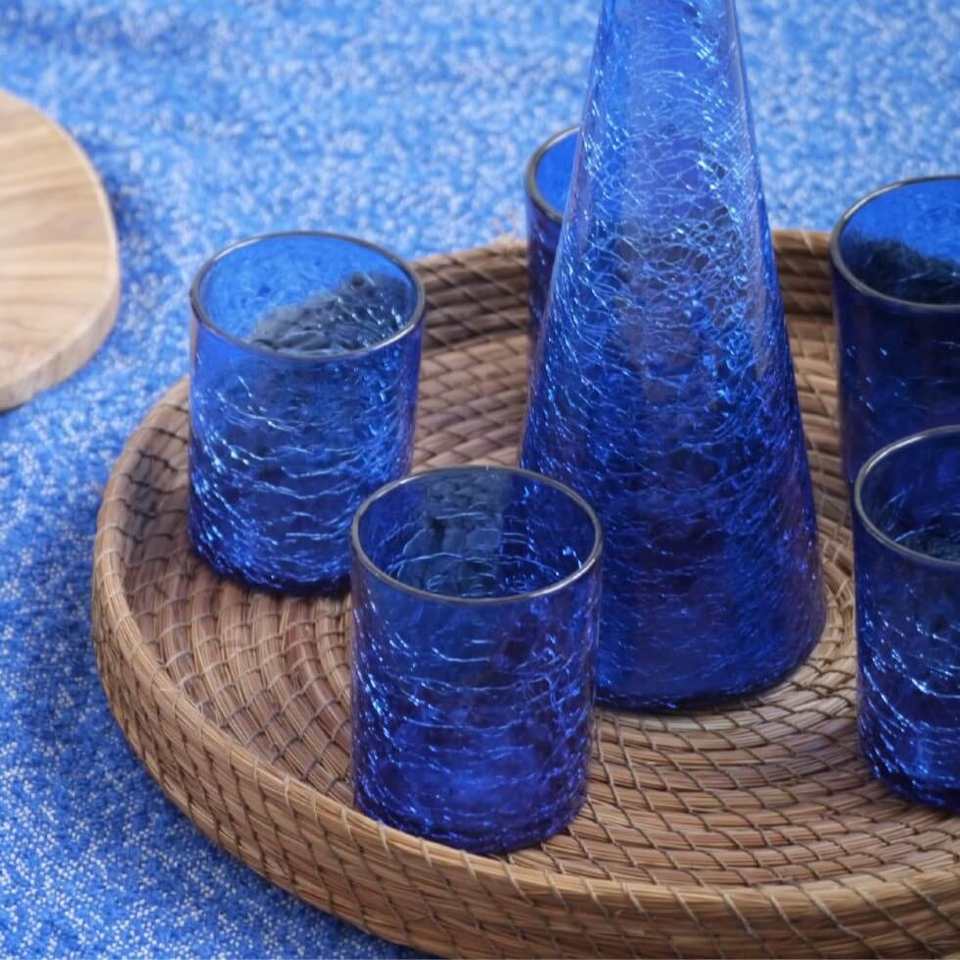 Kara ชุดแก้วแบบเป่าสีน้ำเงินเข้มแตกและมีรอยแตก6ชิ้น & เหยือกใส่ของ