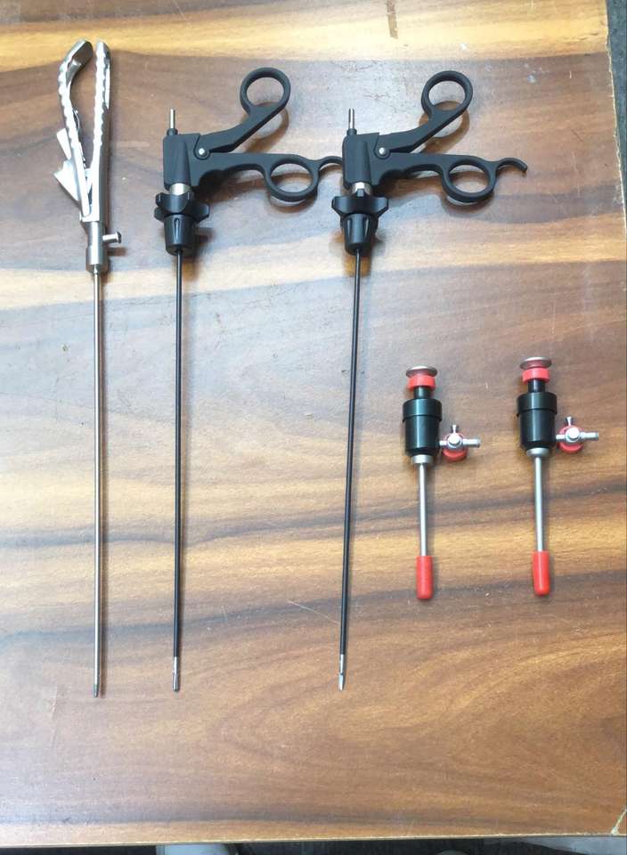 เครื่องมือผ่าตัดทางนรีเวชแบบส่องกล้อง Kara Mediclust ขนาด 3 มม. ประกอบด้วย ที่จับเข็มแบบธรรมดา, ที่จับแบบกรรไกรโค้ง, ทรอคาร์แบบคม ขนาด 3 มม.