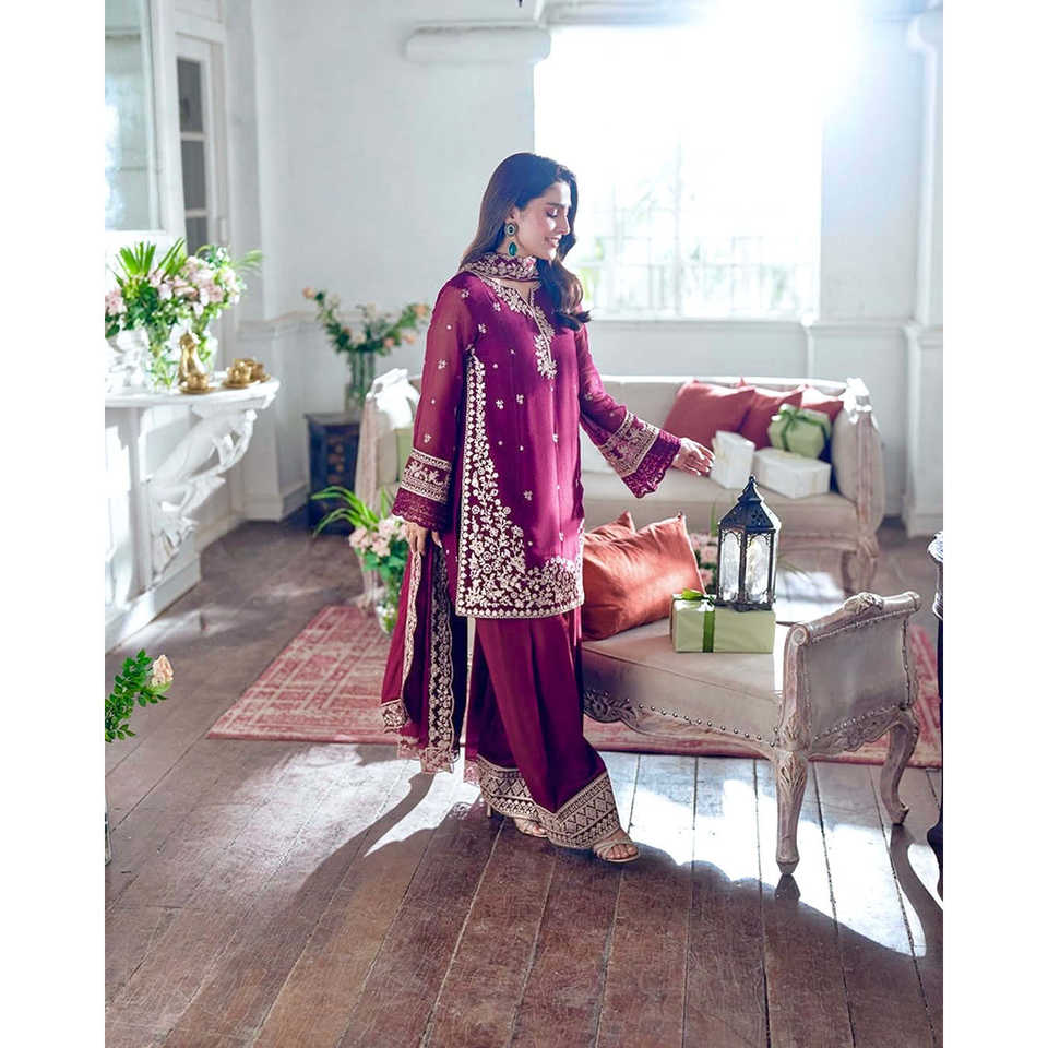 ชุดเสื้อผ้าแฟชั่นสีม่วงสำหรับงานปาร์ตี้ของผู้หญิงจาก Karma Fashion Designer พร้อมผ้าคลุมไหล่สวยงาม