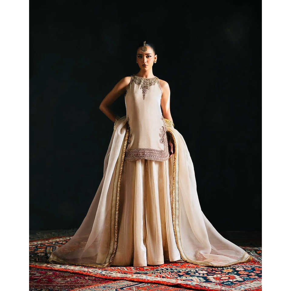 กรรมสีเบจของผู้หญิงแฟชั่นสวยงามด้านบนและด้านล่างพร้อม dupatta สำหรับงานปาร์ตี้ชุดที่สง่างาม