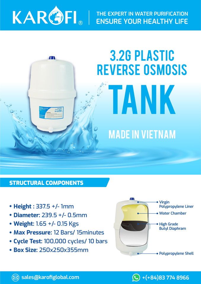 Karofi ถังแรงดันพลาสติก3.2แกลลอนสำหรับเครื่องจักรบำบัดน้ำ RO ที่เก็บน้ำบริสุทธิ์พร้อมการรับประกัน1ปี