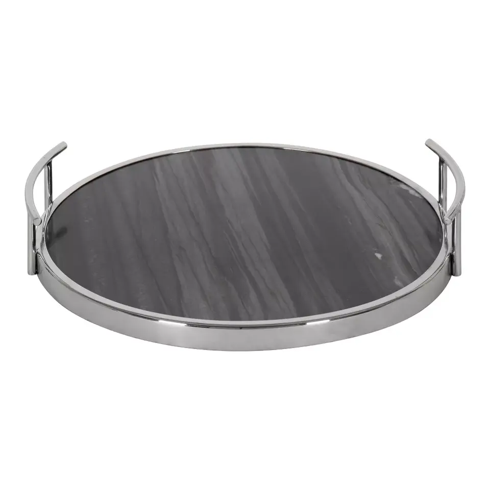 เคทและลอเรลมาร์เบอร์รี่ถาดตกแต่งทรงกลมพร้อมที่จับโลหะหินอ่อนสีเทาและถาดเสิร์ฟโลหะกลมโลหะเงินพร้อมที่จับ