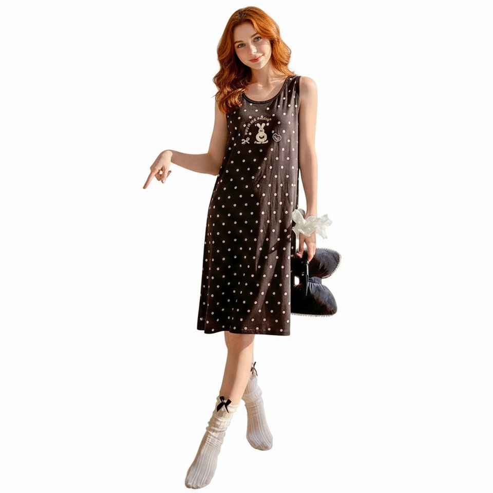 ชุดนอนลูกไม้พิมพ์ลายกระต่ายน่ารัก ชุดนอนฤดูร้อนแขนกุดสไตล์เกาหลีสำหรับสาววัยรุ่น ชุดอยู่บ้านผ้าฝ้ายผสมนุ่ม