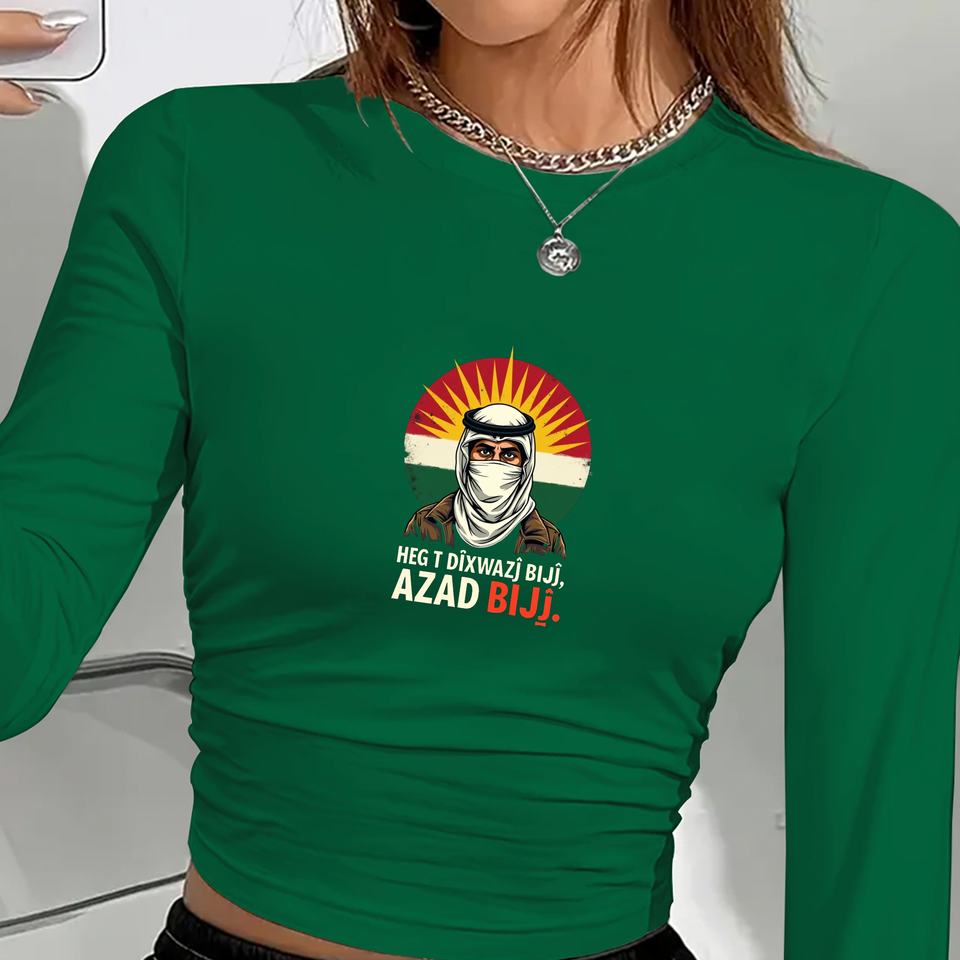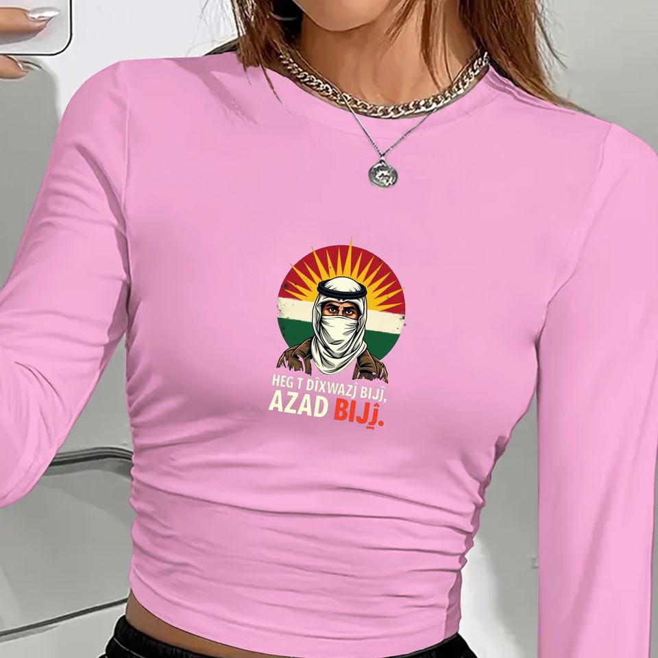 เสื้อแขนยาวพิมพ์ลายเคฟฟียะห์ ธงชาติเคิร์ด ลายภาพประกอบวัฒนธรรมเคิร์ด สำหรับผู้หญิง สไตล์ Y2K ผ้าถักผสมสแปนเด็กซ์/โพลีเอสเตอร์ น้ำหนัก 180 กรัม