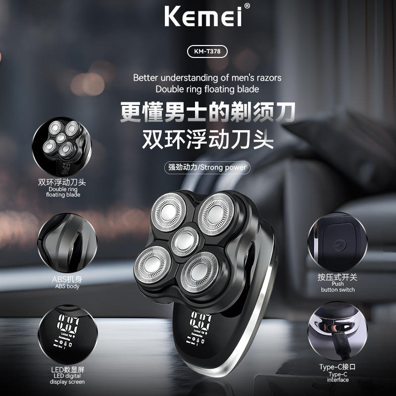 เครื่องโกนหนวดไฟฟ้า Kemei รุ่น KM-T378 ใบมีด 5 ใบ แบบลอยตัว หน้าจอ LED ชาร์จแบบ Type C ล้างทำความสะอาดได้ทั้งตัว