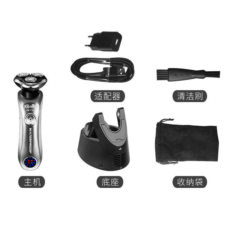 เครื่องโกนหนวดไฟฟ้าแบบโรตารี่ 3 ใบมีดสำหรับผู้ชาย Kemei รุ่น Km-1716 กันน้ำ ชาร์จไฟได้ พร้อมฐานทำความสะอาด ตัวเครื่องโลหะ