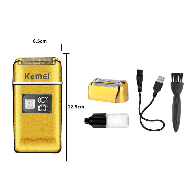 เครื่องโกนหนวดไฟฟ้าแบบชาร์จได้ Kemei รุ่น KM-TX8 สีทอง โลหะ หัวโกนสามหัว ล้างน้ำได้ พร้อมไฟ LED แสดงสถานะ