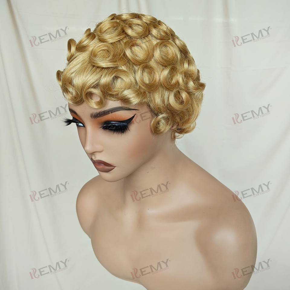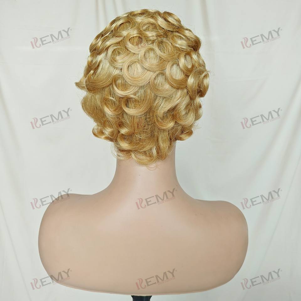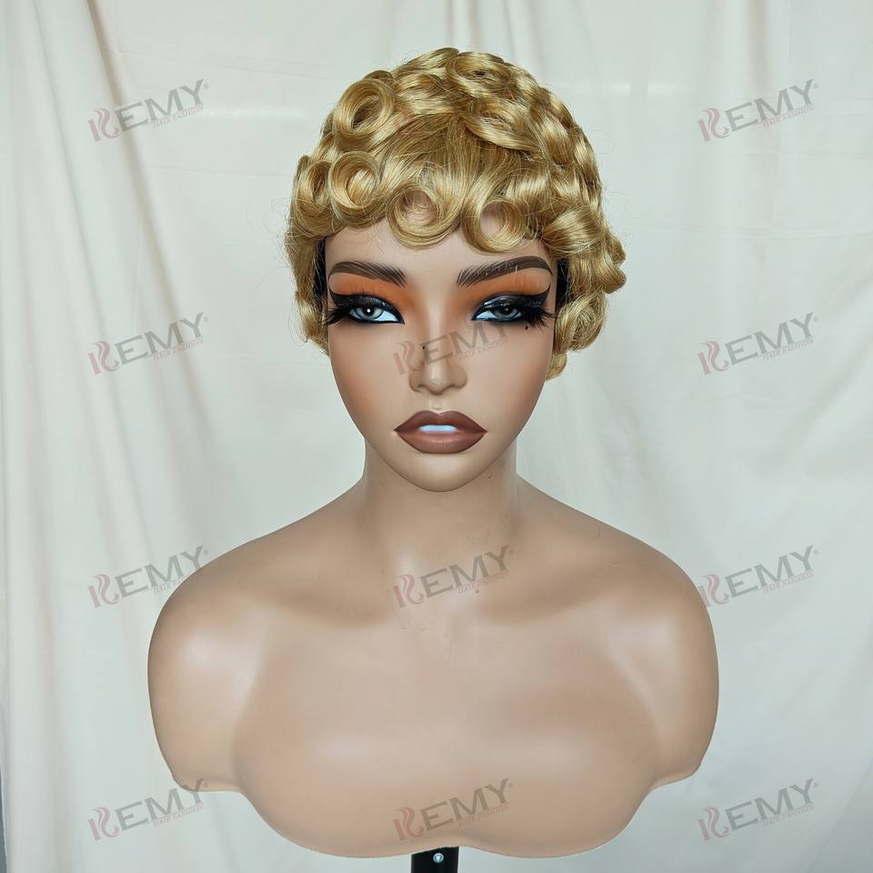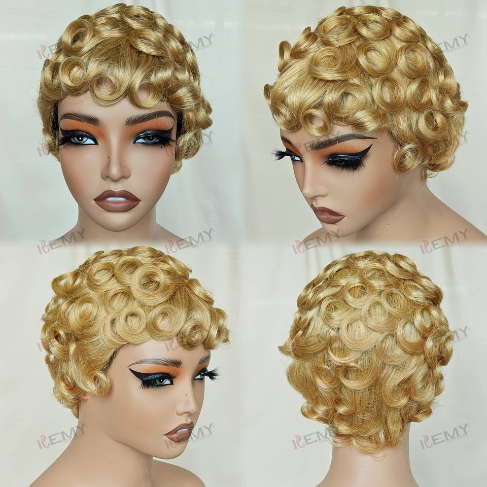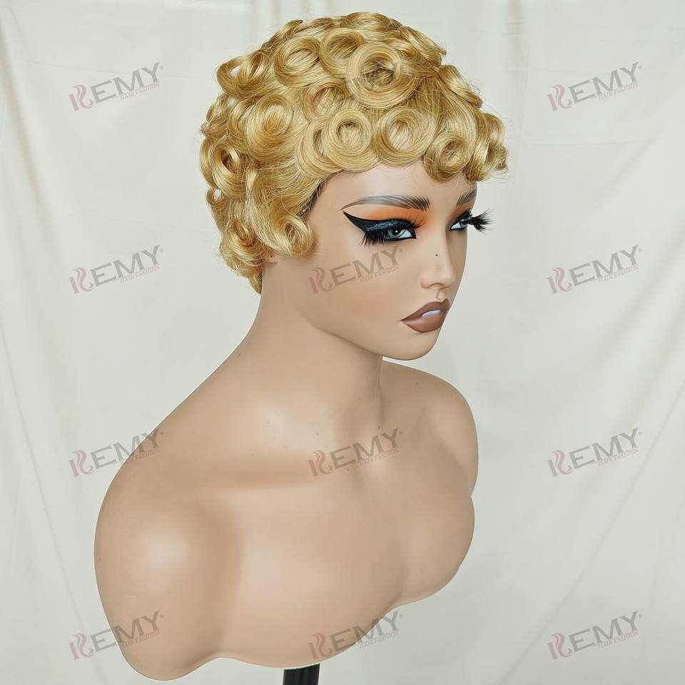 Kemy วิกผมลอนแท้สำหรับผู้หญิงผิวดำวิกผมหยิกสั้นผมมนุษย์วิกผมลอนแบบสั้นผมต่อผมสีบลอนด์ผมหน้าม้า
