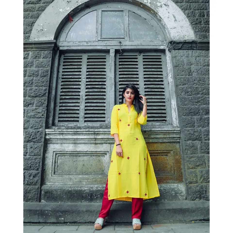 ชุดคุรตะเรยอนสีเหลือง Kesariya สำหรับผู้หญิง งานฝีมือแบบดั้งเดิมของอินเดีย ตกแต่งด้วยด้ายและกระดุม