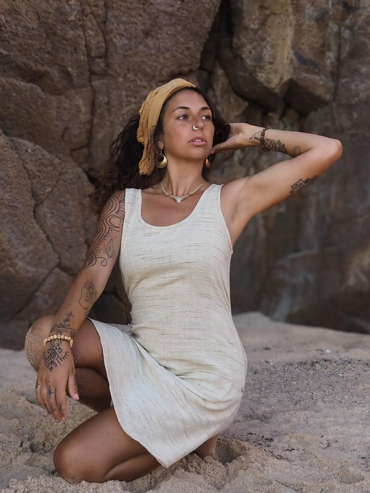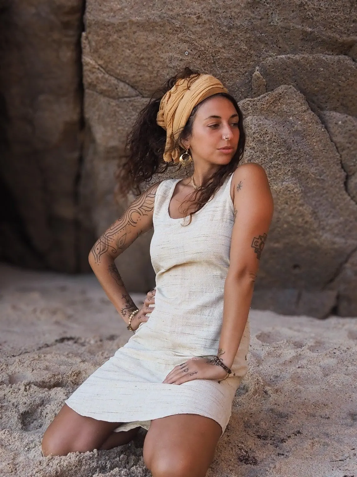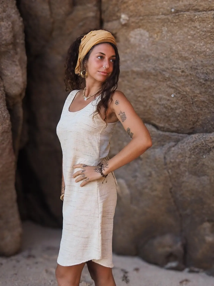 Khadi ชุดเดรสสั้นสไตล์ยิปซี, ผ้าฝ้าย100% ชุดเดรสสั้นสไตล์ลำลองความยาวขนาดเล็กระบายอากาศได้ดีมีลวดลายสีทึบและซับในด้วยผ้าฝ้าย