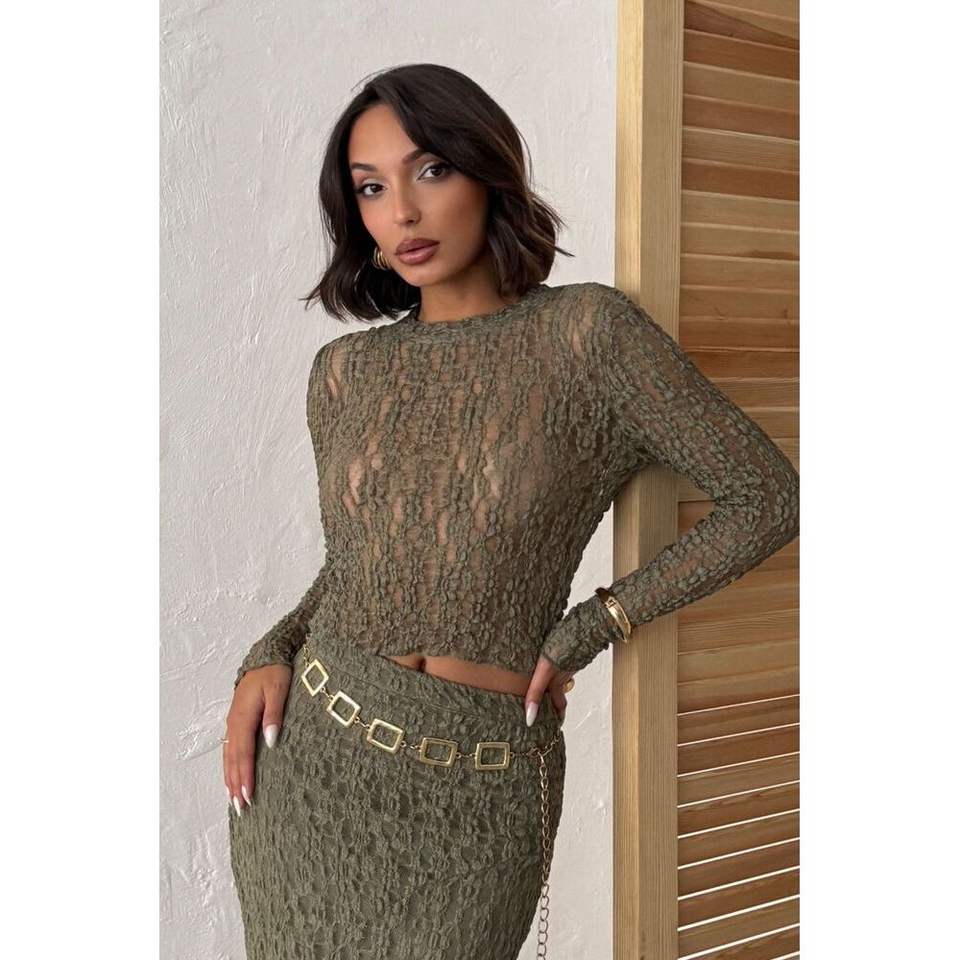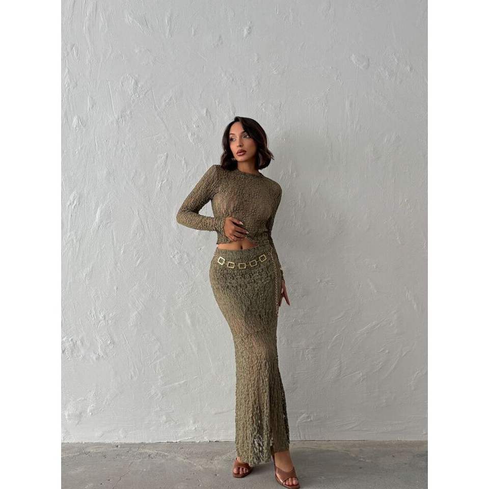 เสื้อผู้หญิงแขนยาวสีกากี ดีไซน์โปร่งใส มีจำหน่ายขายส่ง
