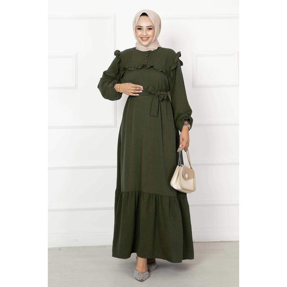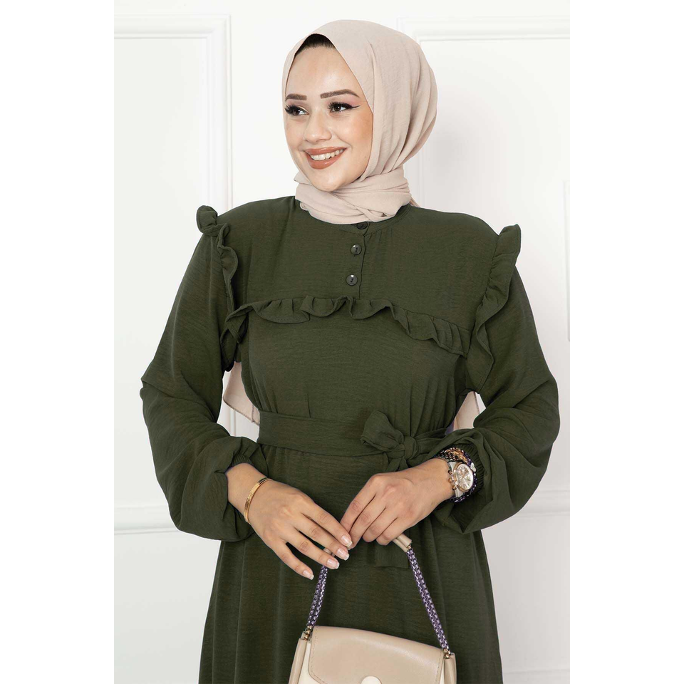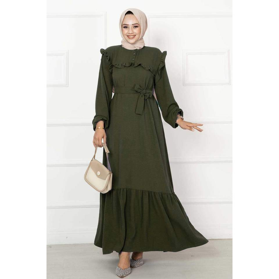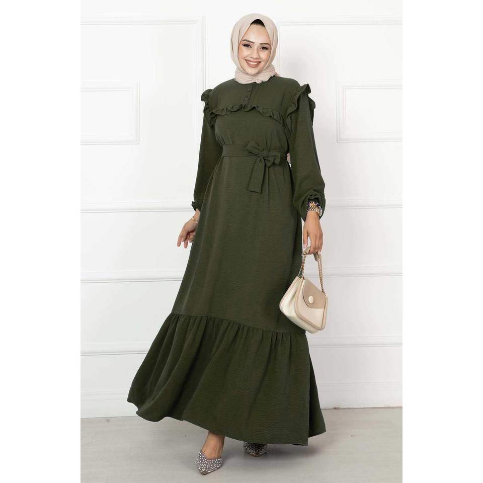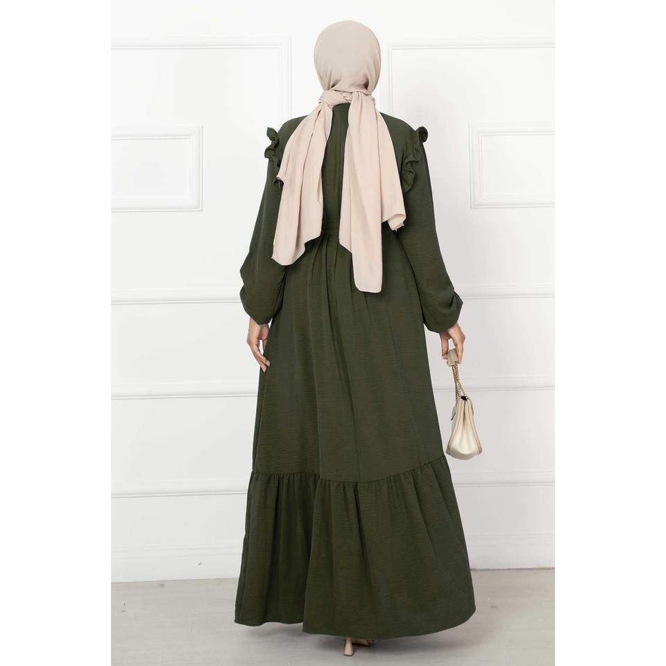 สีกากีชุดเดรสลำลองมีระบายครึ่งกระดุม