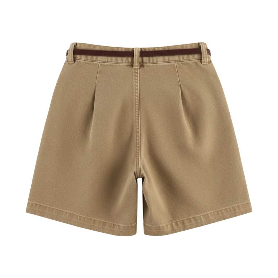 กางเกงยีนส์ขาสั้นสีกากีทรงพลีทเอวสูงพร้อมเข็มขัด ผ้าฝ้าย ทรงหลวม สวมใส่สบายสำหรับฤดูร้อนสำหรับผู้หญิง