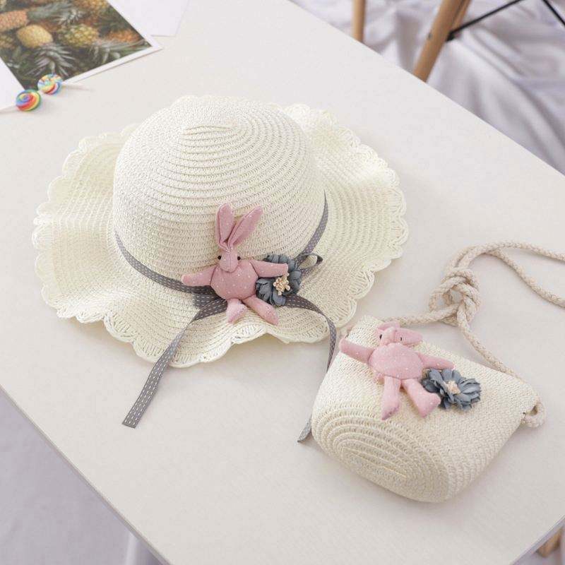หมวกเด็กฤดูร้อนราคาถูก หมวกฟางเด็กน่ารัก พร้อมกระเป๋าเก๋ไก๋ สำหรับขายส่ง