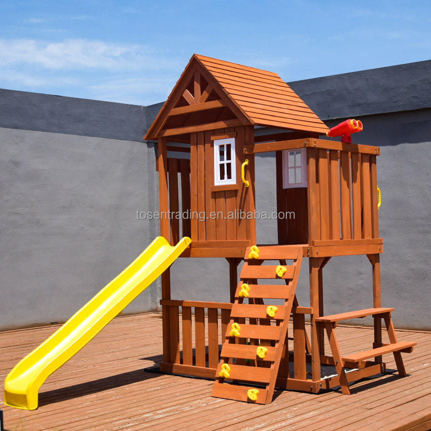 Kid's Wooden Playhouse with Slide and Climbing Ladder - Outdoor Backyard Play Set for Toddlers Includes Play Telescope and Bench
