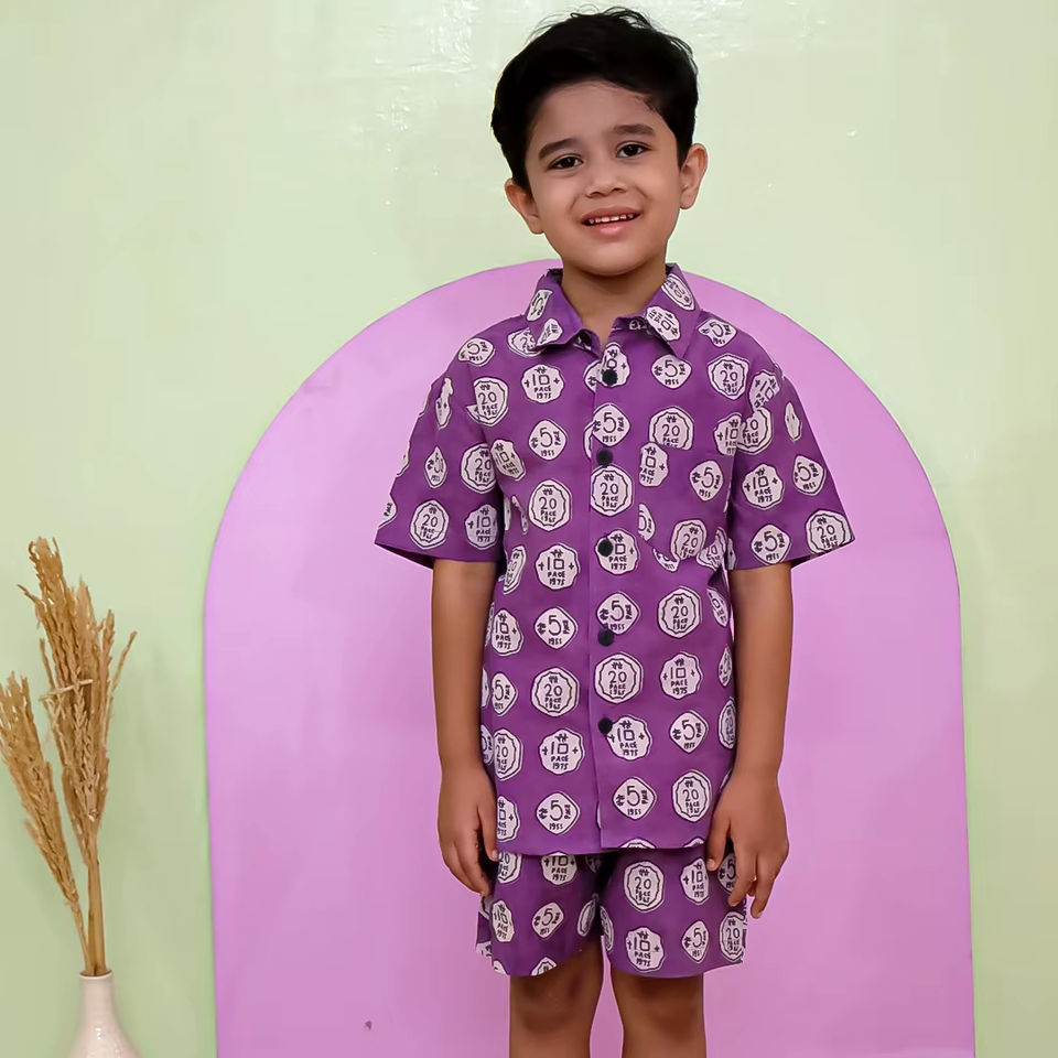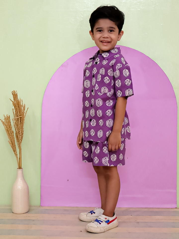 ชุด2ชิ้นสำหรับเด็กผู้ชายชุด2ชิ้นเสื้อกระดุมและกางเกงขาสั้นพิมพ์ลายชุดปาร์ตี้ชายหาดแบบลำลอง