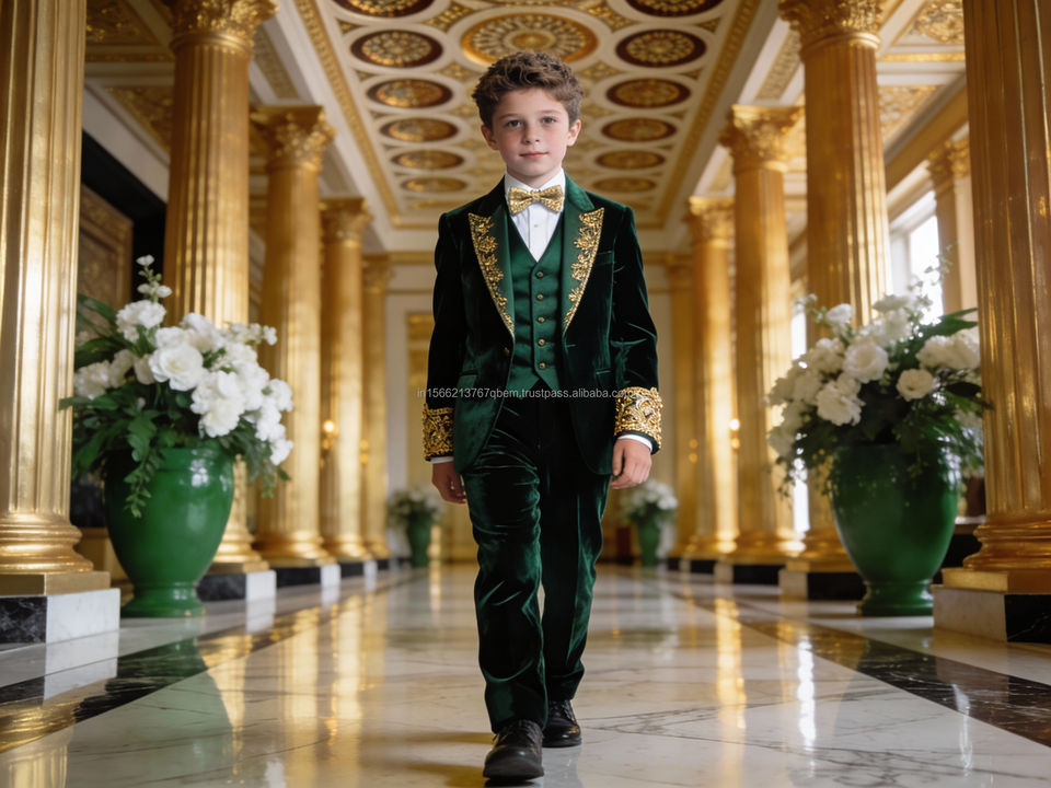 ชุดทักซิโด้กำมะหยี่สีน้ำตาลสำหรับเด็กพร้อมงานปักสีทอง – ชุดสูทสำหรับงานแต่งงานและงานปาร์ตี้สำหรับเด็กผู้ชายขายส่ง