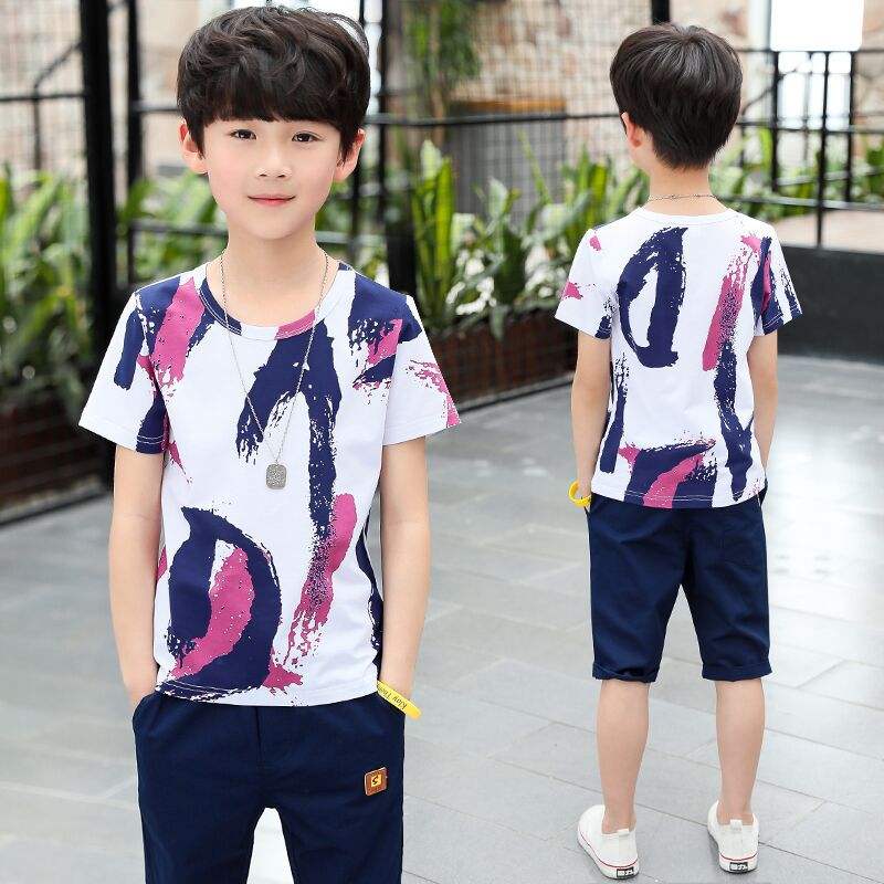 ชุดเสื้อผ้าเด็กผู้ชายฤดูร้อน ชุดใหม่ เสื้อแขนสั้น 2 ชิ้น ชุดเซ็ตสำหรับเด็กโต ขายส่ง