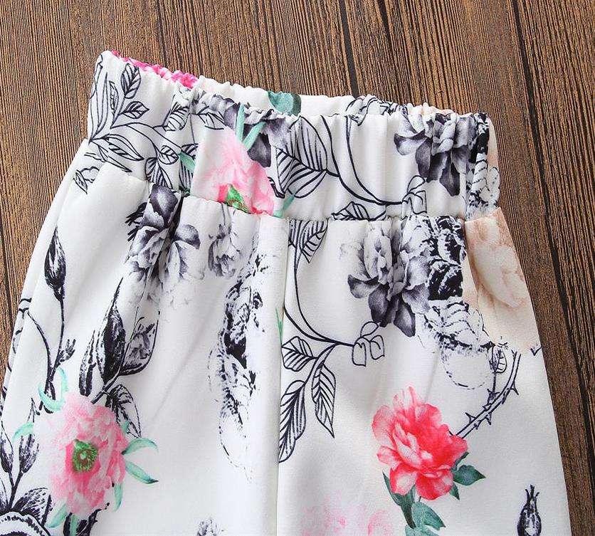 คำอธิบาย:ชุดกางเกงขาบานบางสำหรับเด็กผู้หญิง พร้อมกางเกงเลกกิ้งลายดอกไม้สำหรับผู้หญิง