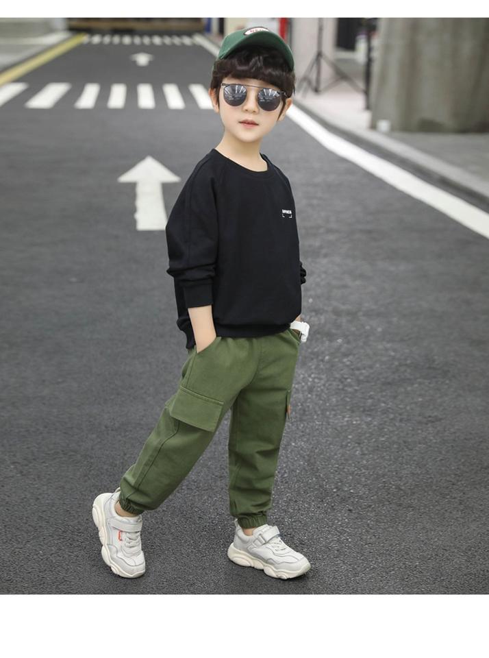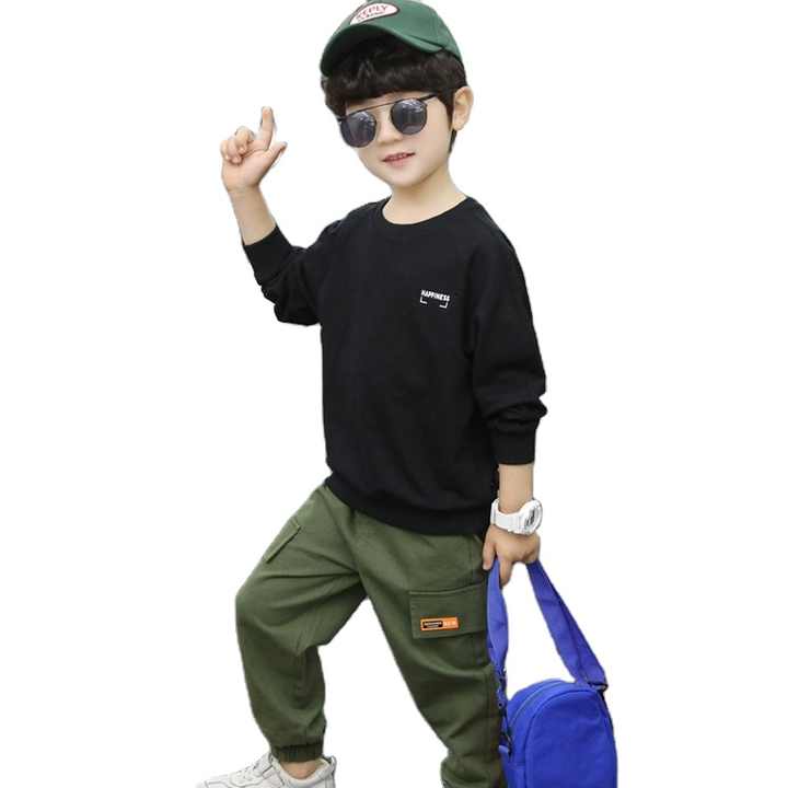 เสื้อผ้าแฟชั่นเด็ก ดีไซน์ใหม่ เสื้อสเวตเตอร์สีดำพิมพ์ลายตัวอักษรสำหรับเด็ก พร้อมกางเกงเอี๊ยมขายาว ชุดเซ็ตสำหรับเด็กผู้ชาย