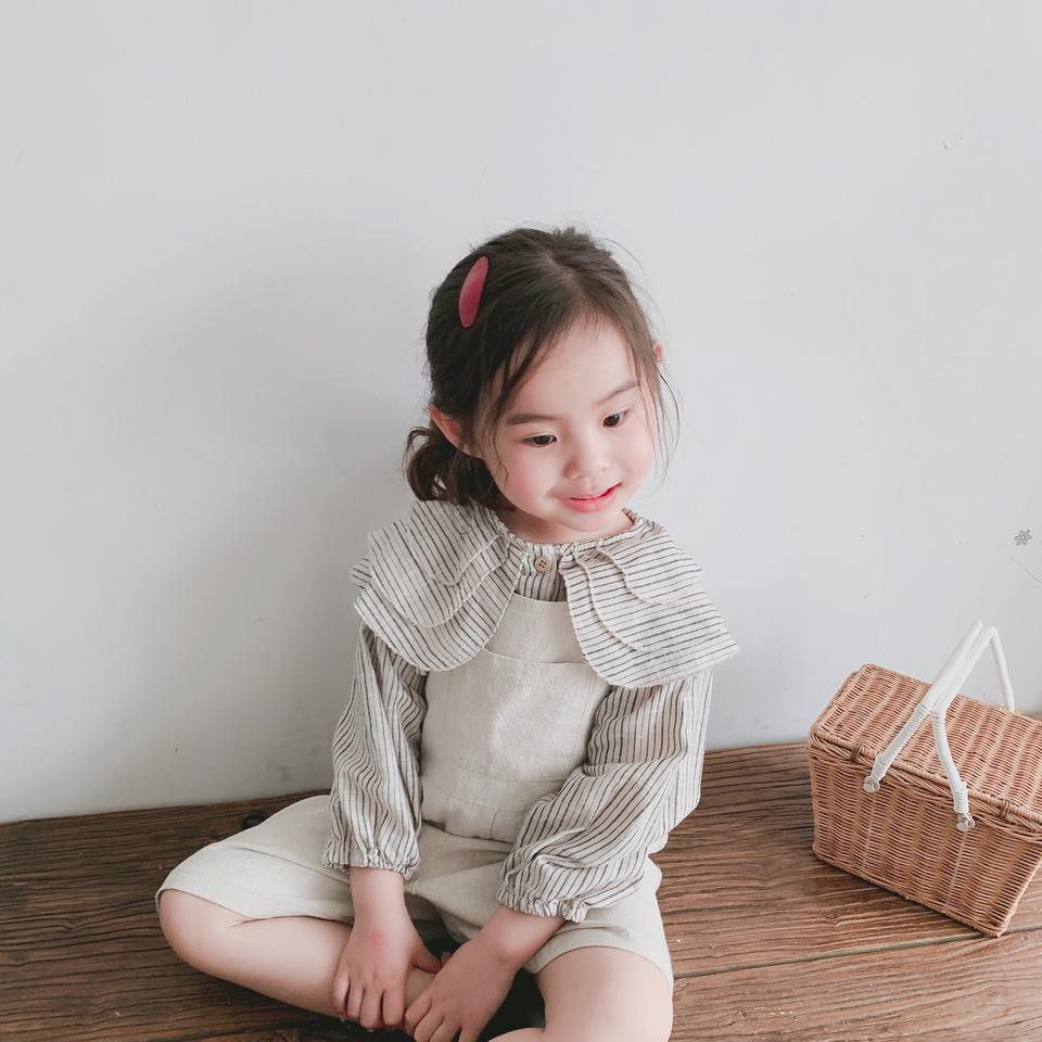 เสื้อเชิ้ตผ้าลินินแขนยาวสำหรับเด็กผู้หญิง ลายทาง ปกคอเสื้อพับได้ เสื้อผ้าเด็กผู้หญิงสำหรับฤดูใบไม้ผลิและฤดูใบไม้ร่วง เสื้อผ้าเด็กผู้หญิง เสื้อผ้าลินิน