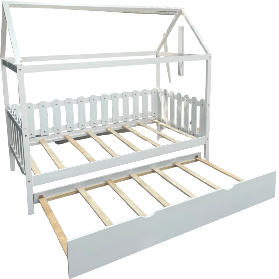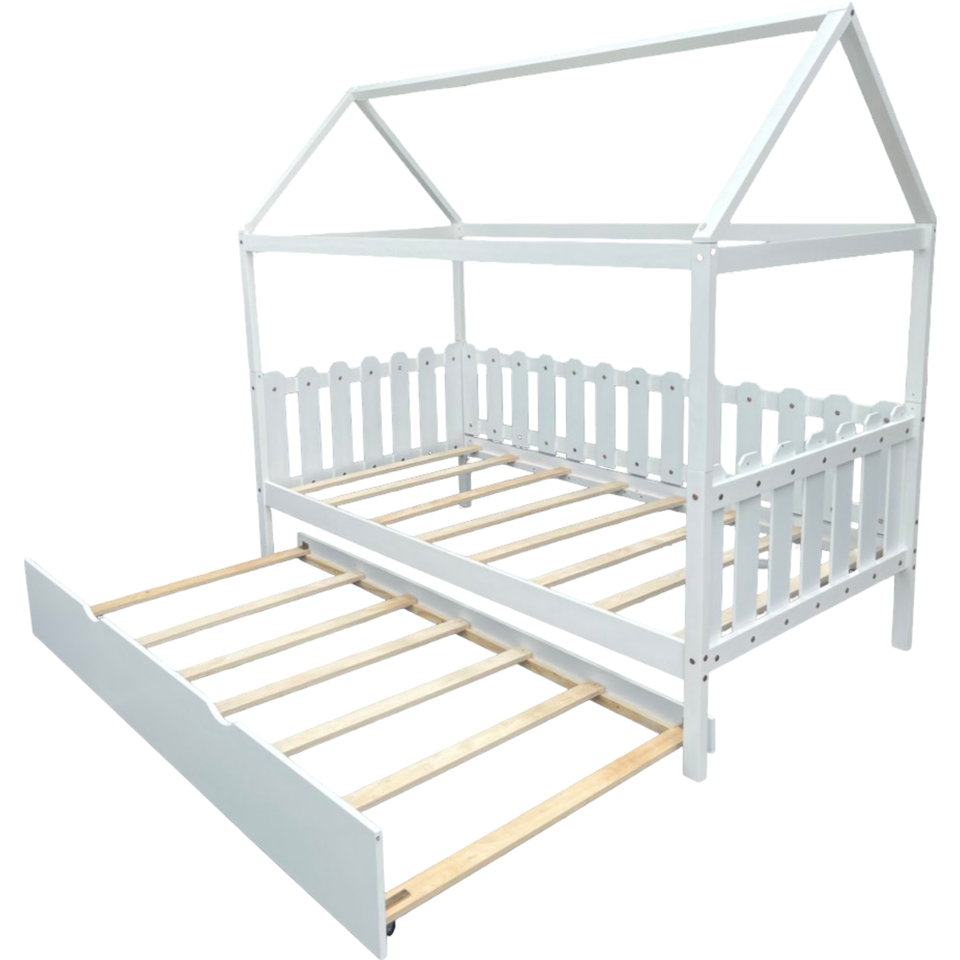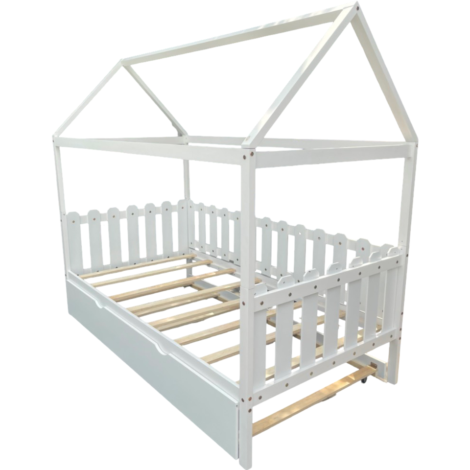 Kids House Bed Frame with Trundle - Wooden Floor Bed with Roof Design for Boys or Girls Room