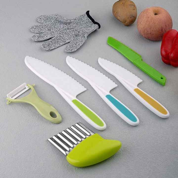 มีดพลาสติกสำหรับใช้ในครัวปลอดภัยสำหรับเด็กมีดผลไม้สำหรับเด็กวัยหัดเดินถุงมือทำอาหารจริงขอบหยักชุดมีดผลไม้สำหรับเด็ก