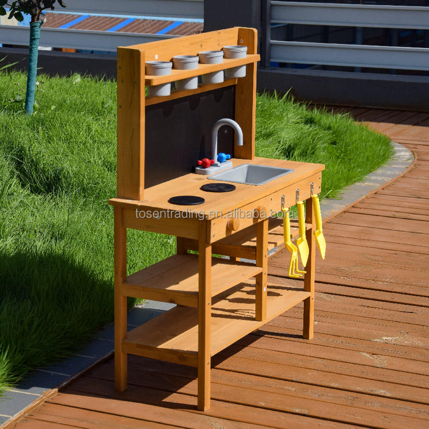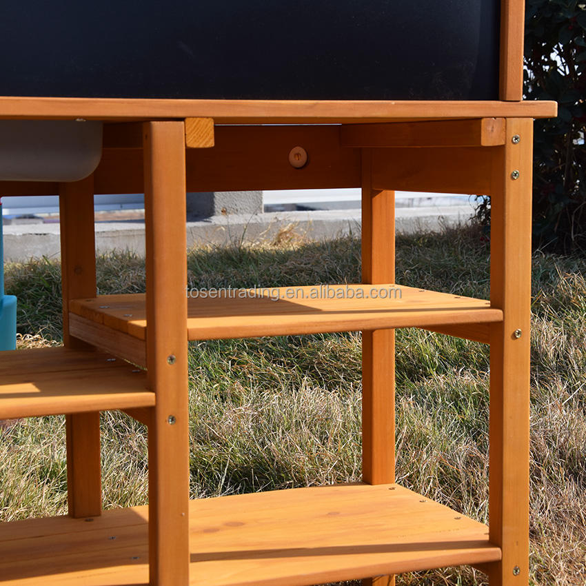 ครัวไม้เด็กเล่นกลางแจ้งพร้อมกระดานดำและชั้นเก็บของ สไตล์มอนเตสซอรี่ สำหรับพื้นที่เล่นในสวนและลานบ้าน