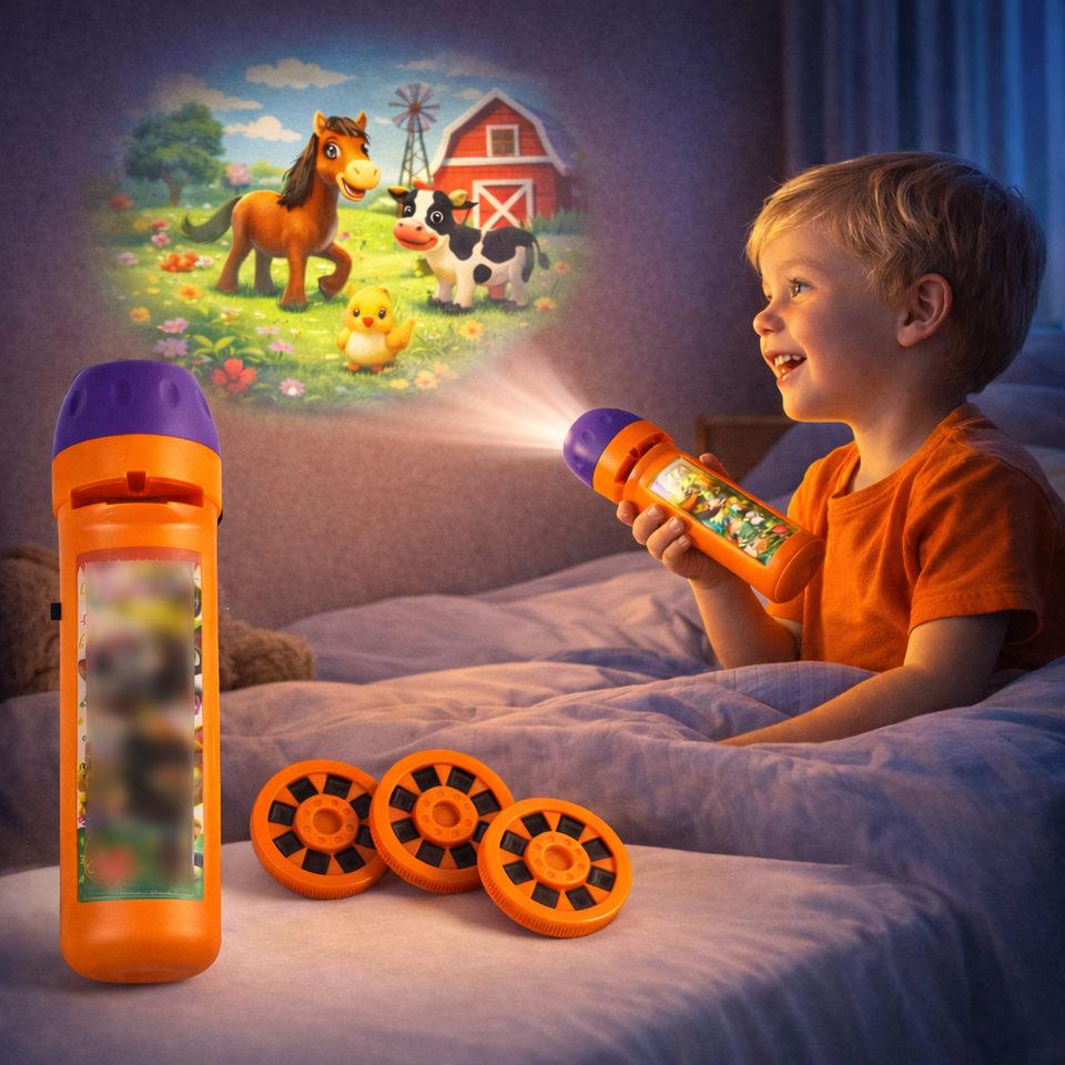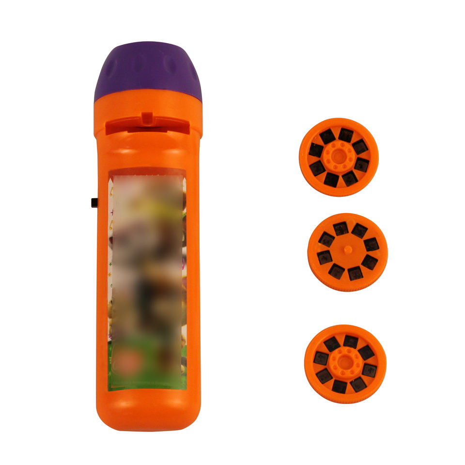 ไฟฉายโปรเจคเตอร์แบบเลื่อนได้สำหรับเด็กมีไฟส่องสว่างเพื่อการศึกษาแผ่นดิสก์หลายภาพสำหรับการเล่าเรื่องการเล่นตอนกลางคืนรางวัลในห้องเรียน