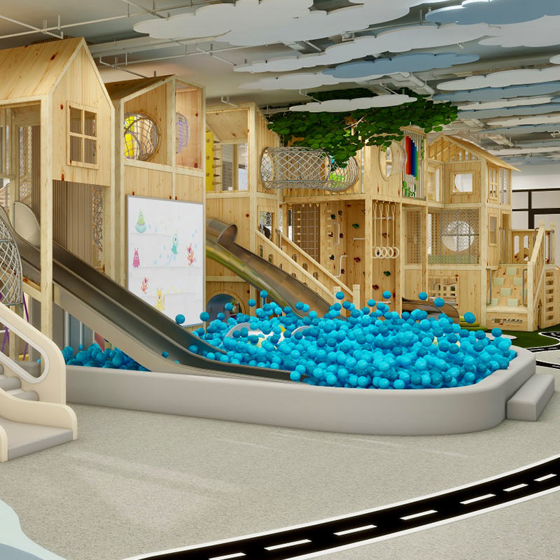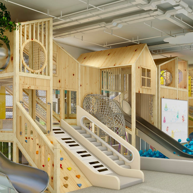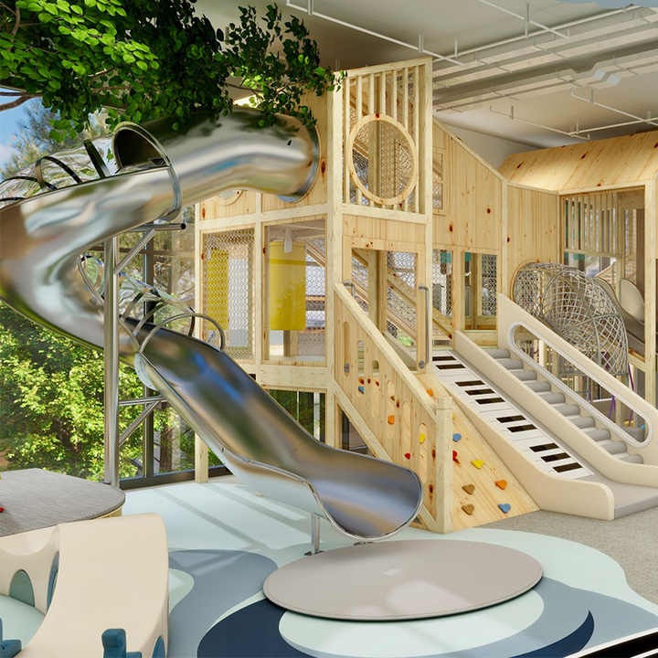บ้านต้นไม้สำหรับเด็กพร้อมสไลเดอร์เล่นคาเฟ่อุปกรณ์สำหรับพื้นที่เด็กเล่นในร่มตามสั่ง