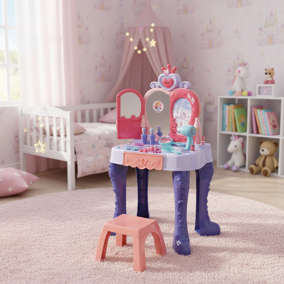 ชุดโต๊ะเครื่องแป้งเด็ก พร้อมกระจกเซ็นเซอร์ไฟส่องสว่างและเสียงเพลง สำหรับแต่งตัวเล่นบทบาทสมมติ