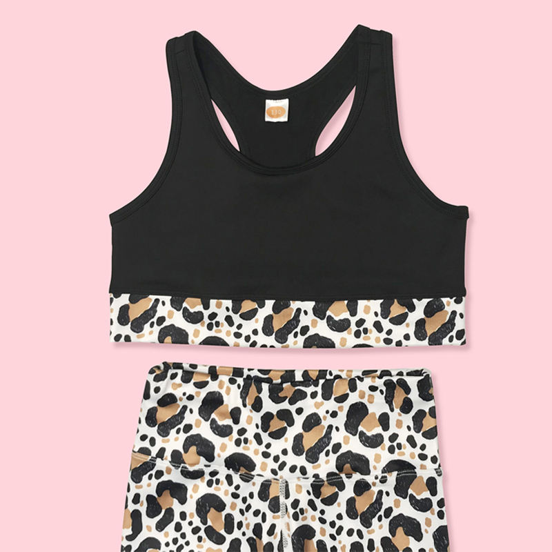 เสื้อโยคะเด็กผู้หญิงลายเสือดาวพร้อมกางเกงเลกกิ้งกีฬาขายส่ง ชุดกีฬาเด็ก กางเกงเลกกิ้งเด็ก