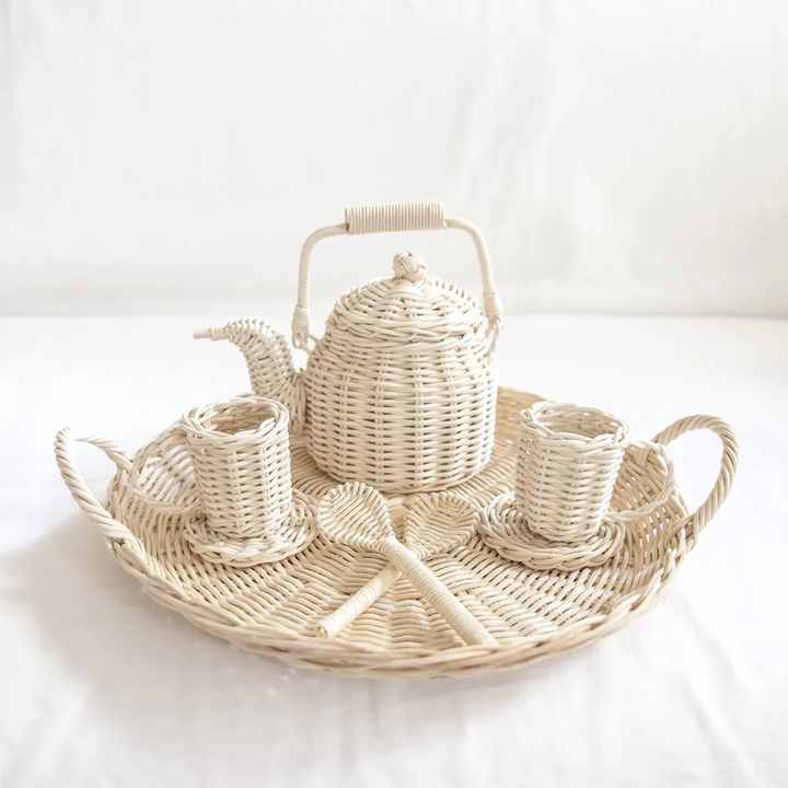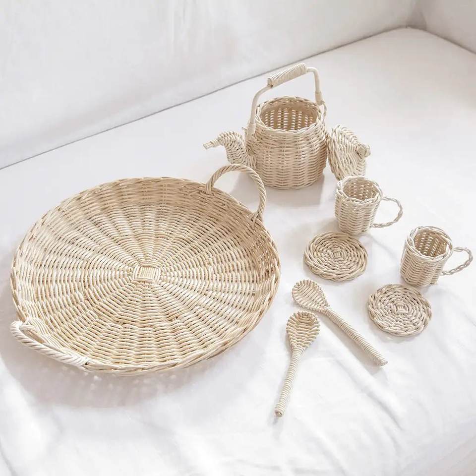 ชุดของเล่นเด็ก ชุดน้ำชาจิ๋วทำจากหวาย ชุดน้ำชาหวายทำมือขนาดเล็ก ขายส่ง