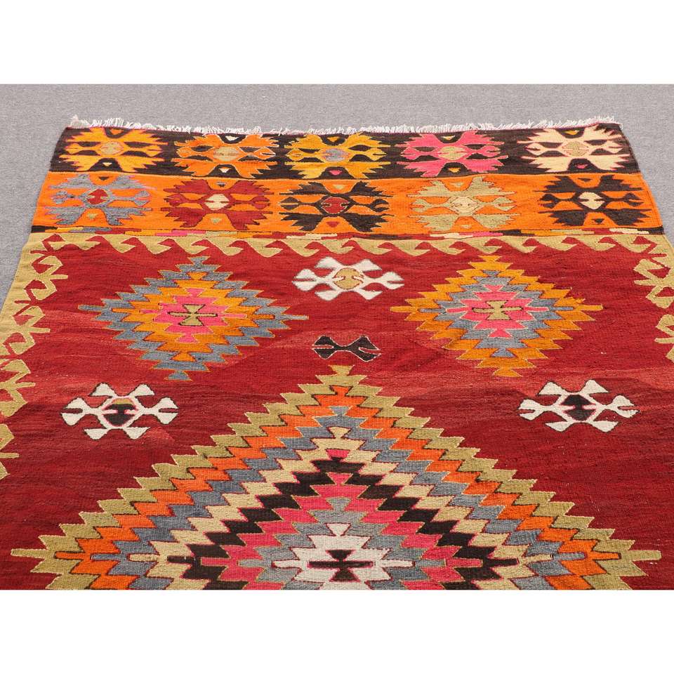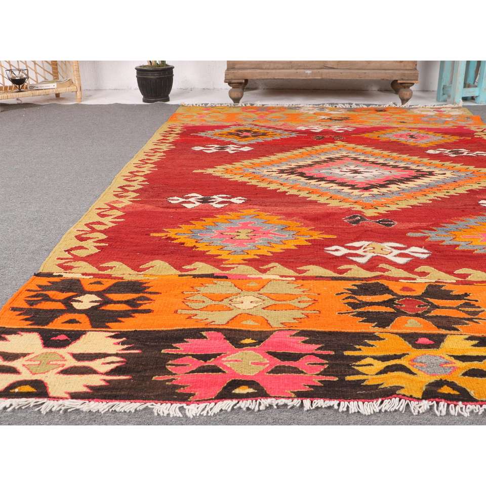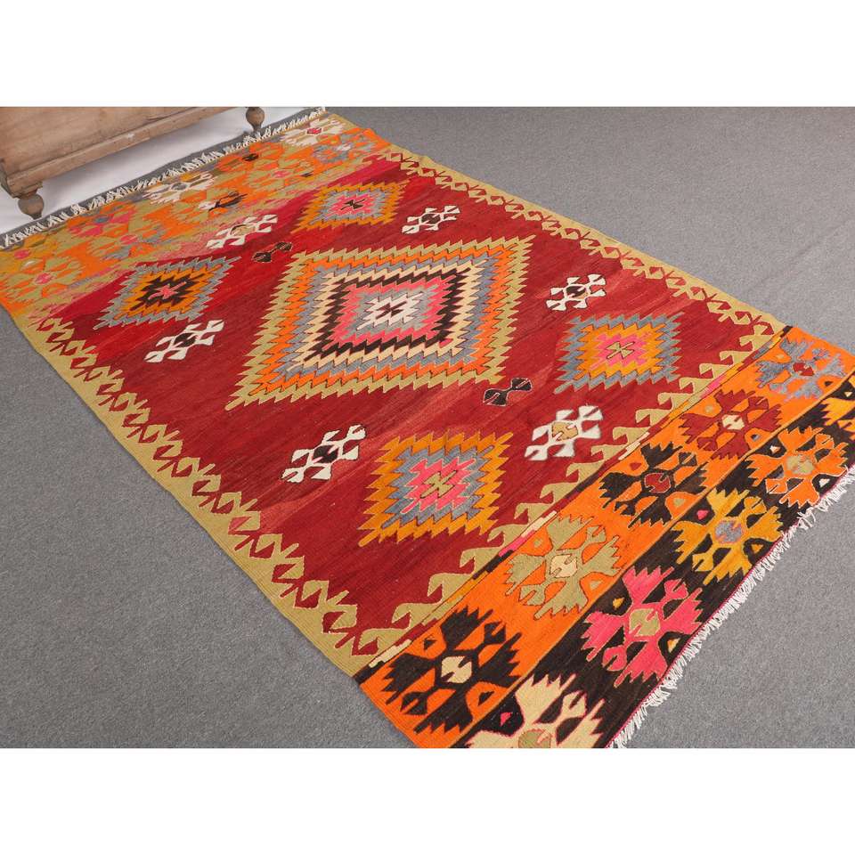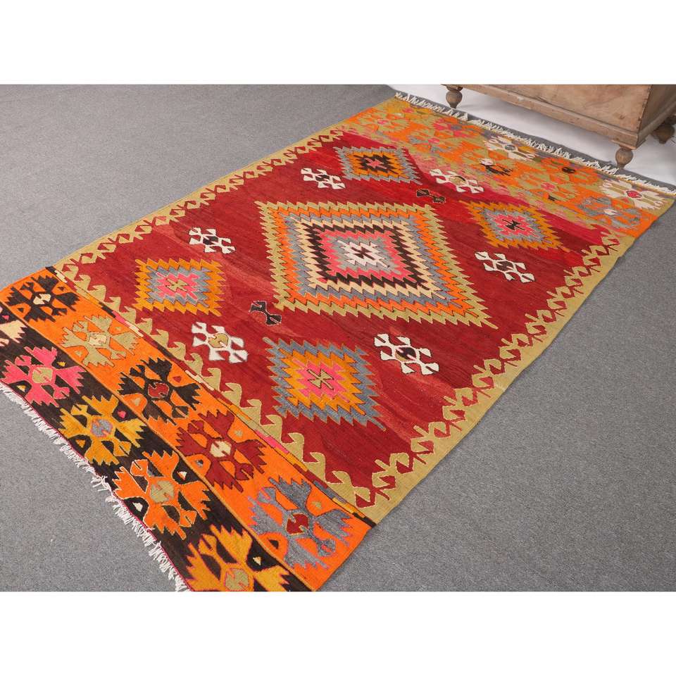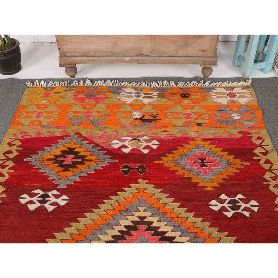 พรมคิลิมวินเทจ ขนาด 4.9x7.9 ฟุต พรมตุรกี พรมขนสัตว์สีแดงไล่เฉด