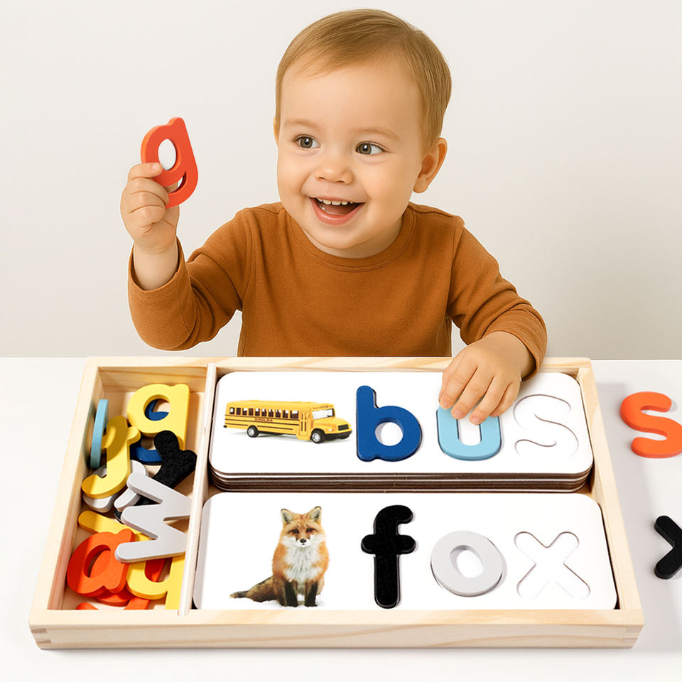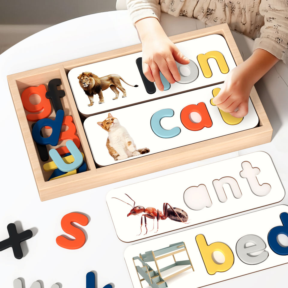 เกมส์ตัวอักษรสำหรับเด็กอนุบาล ชุดสร้างคำศัพท์ CVC ของเล่นไม้ฝึกสะกดคำ พร้อมกล่องเก็บ