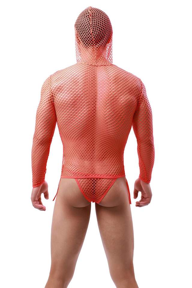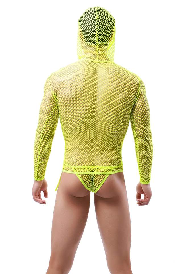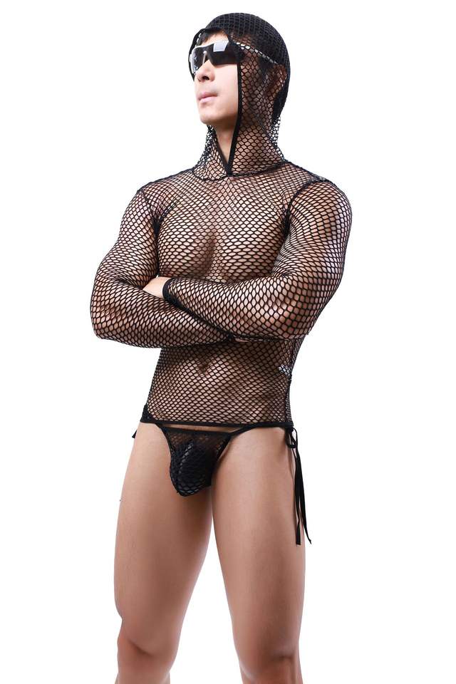 ชุดชั้นในตาข่ายซีทรูแขนยาวแบบมีฮู้ดสำหรับผู้ชาย ยี่ห้อ King Mcgreen Star Men เหมาะสำหรับใส่ไปไนต์คลับ งานปาร์ตี้ หรือเป็นเสื้อซับใน