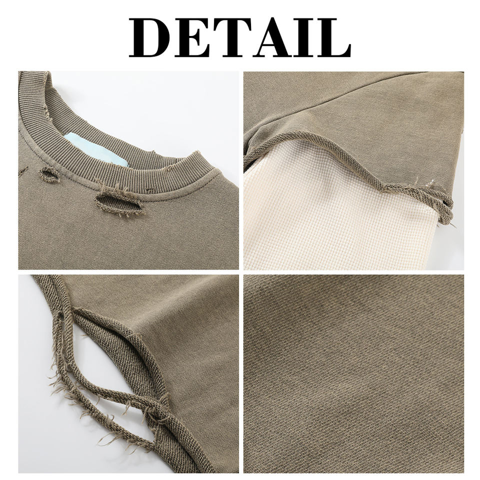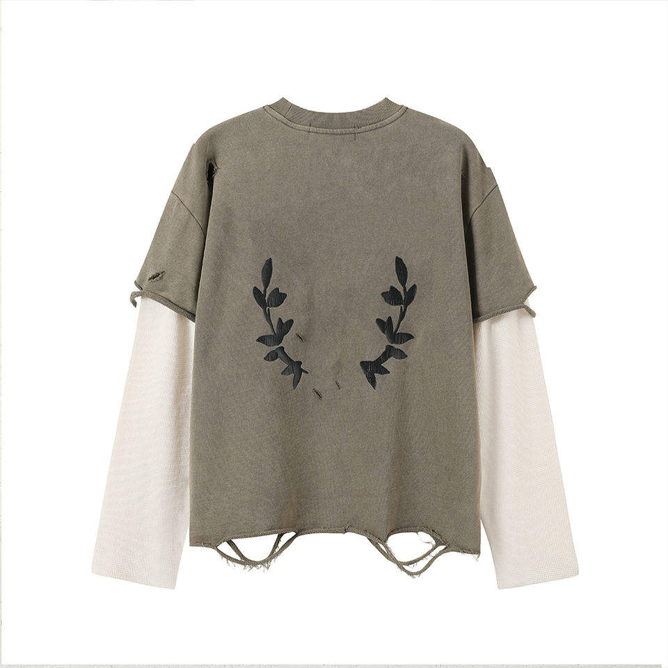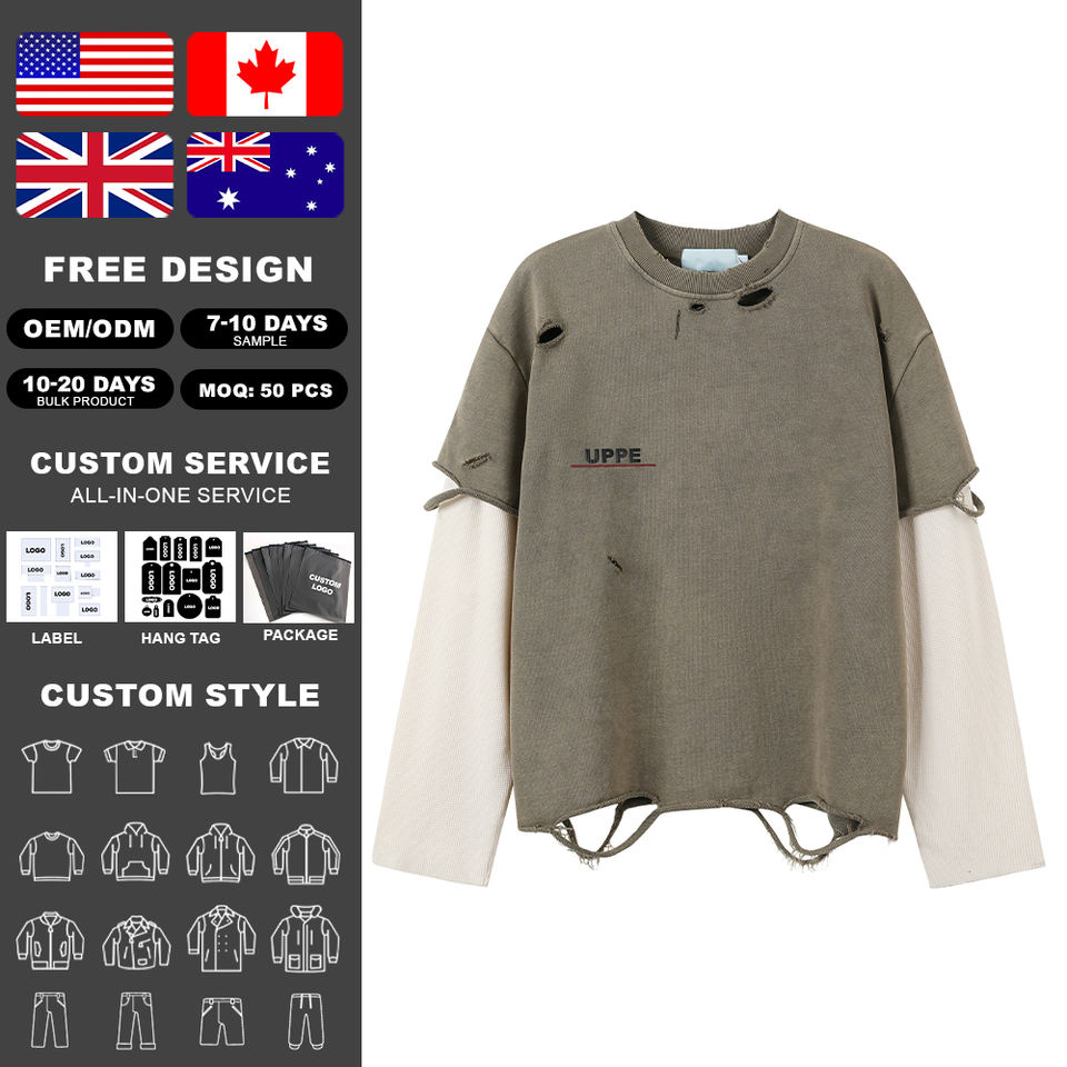 เสื้อยืดคอกลมแขนยาวสองชั้นผ้าฝ้ายแท้ 100% คุณภาพสูงจาก KingSen ดีไซน์ขาดๆ แบบดิสเทรส ตัดเย็บด้วยวัสดุเป็นมิตรต่อสิ่งแวดล้อม ไม่ยับง่าย สไตล์ฮิป